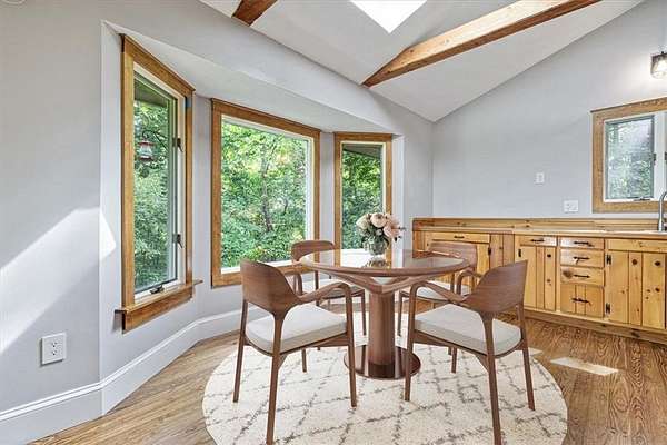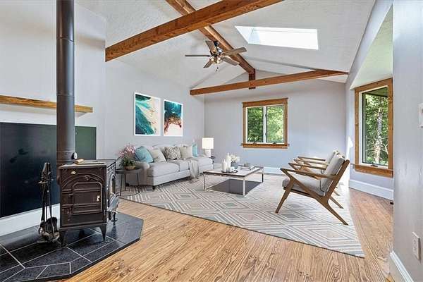 Recent updates include a new roof and skylights (2023), new furnace and water heater (2024), whole-house water filtration, hardwood floors, remodeled primary bathroom, and a private deck off the primary bedroom. Bonus den or office space adds flexibility for guests or remote work. Refrigerator, washer, and dryer convey.