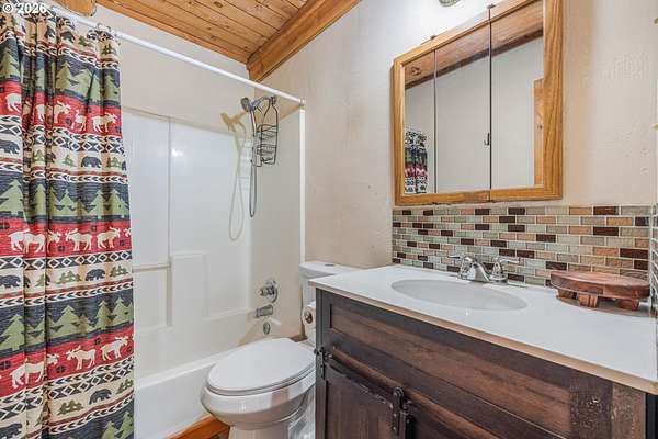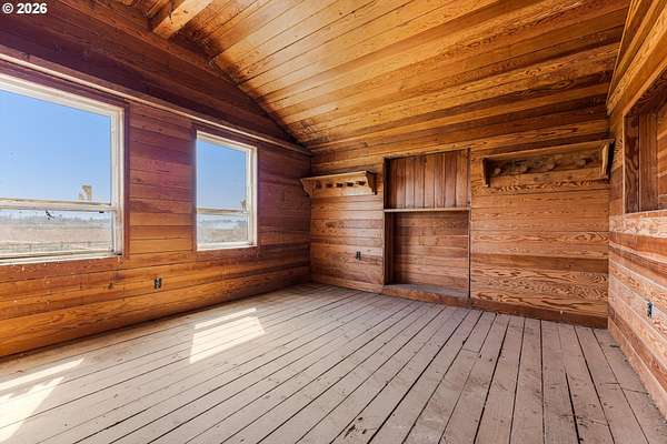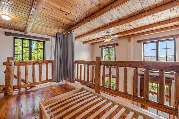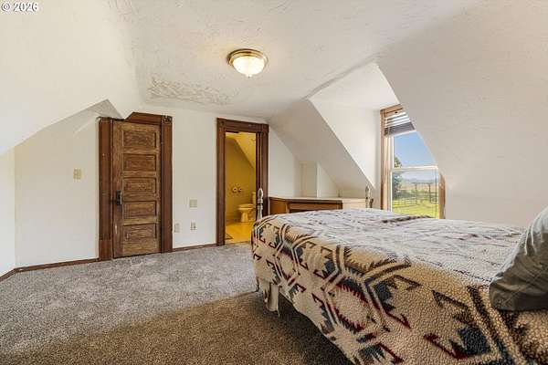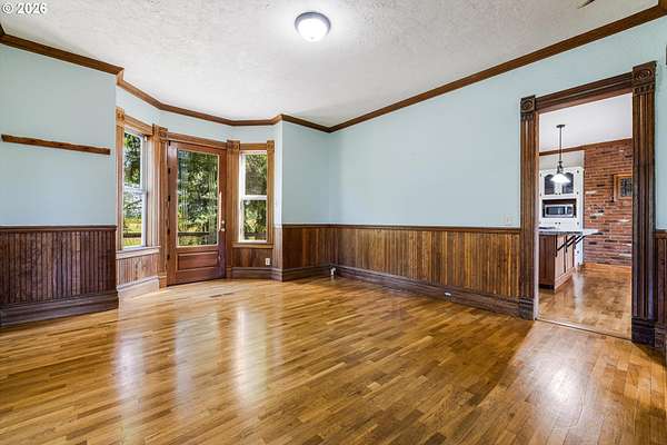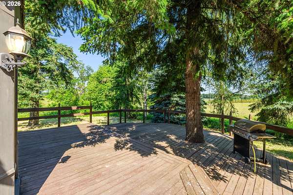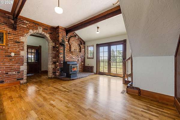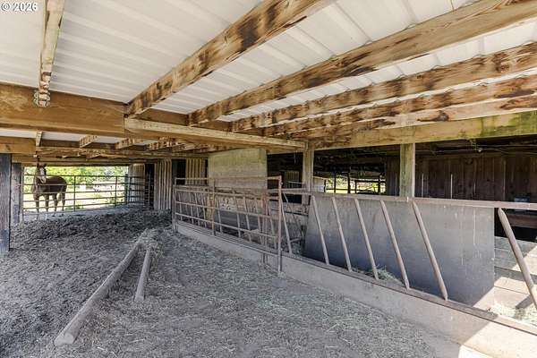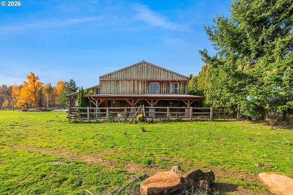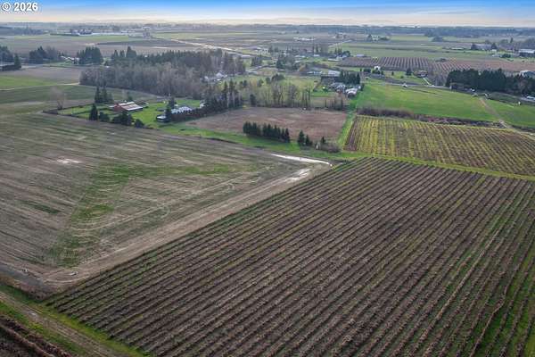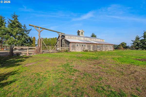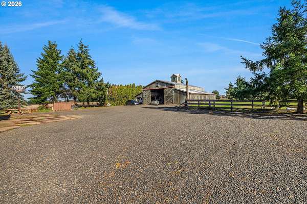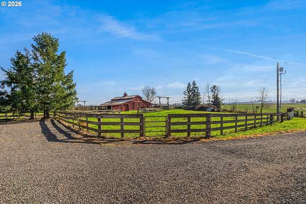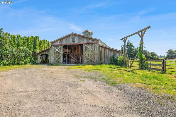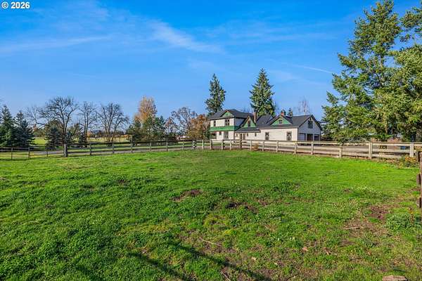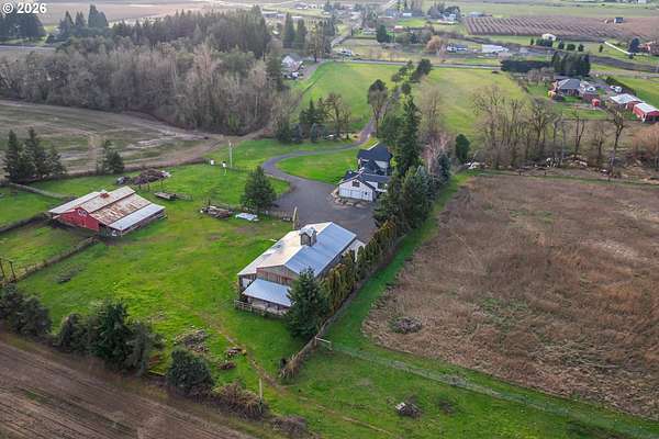 Rare opportunity to own 47 acres of flat farmland just minutes from I-5, offering Mt. Hood views, privacy, and exceptional flexibility for rural living or income potential. A long driveway flanked by hay fields sets a peaceful tone and leads to a character-filled Victorian farmhouse with original details such as stained glass and custom millwork, blended with updates for modern convenience including a kitchen with quartz counters, large island with gas range, and stainless steel appliances. The main living and dining areas open to an expansive deck, and a main-level room offers flexibility as a bedroom or office. Upstairs features three bedrooms and three full bathrooms, an uncommon layout for a home of this era. The property includes multiple independent living spaces, ideal for multi-generational living or rental income. Above the main garage is a semi-finished studio apartment with kitchen, bathroom, private entrance, and potential dedicated garage space. The shop building features a small studio with bathroom at the front, plus a separate two-story apartment built in 1996 at the rear with two bedrooms, two bathrooms, full kitchen, and a large covered patio overlooking Mt. Hood and surrounding farmland. Outdoor amenities include a large shop with a hay loft, a separate barn with stalls and a two-story tack room, and gated pasture, making this property well suited for equestrian use, cattle, or hobby farming. Approximately 35 acres have previously been leased, most recently for blackberries; the lease has been completed and new leasing interest provides flexibility for future owners. Currently under EFU deferral. Non-irrigated but tiled. A unique opportunity to restore, update, and reimagine a versatile rural estate with space, infrastructure, and location that are increasingly hard to find.