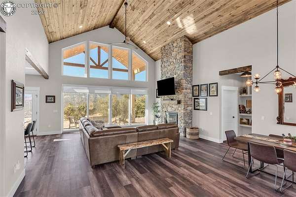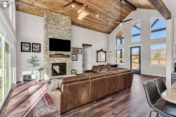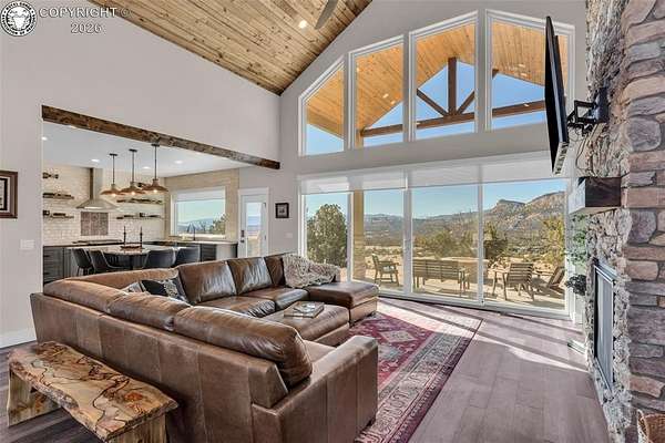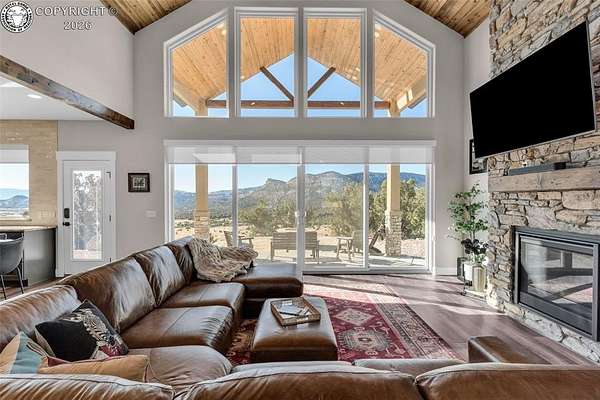 Outstanding Mountain Home built by Accent Homes, with floor to ceiling windows, taking in the wonderful valley and mountain views! This chalet style home is only 2 years old and features all wood plank cathedral ceilings and open beam architecture, and solid 3-panel custom doors throughout, and "Easy Touch" blinds. Beautiful luxury plank flooring and a grand two-way fireplace. Exceptional kitchen with custom cabinetry, a pantry, retractable shelving, granite counter tops and high grade appliances. Spacious master suite with walk-in closet, a 5 piece bathroom with heated floor and barn door entrance, double vanity, and both a luxury tub and a walk-in shower. Nice finished 3-car garage with epoxy painted floor with limited lifetime warranty. Wide open covered patio with a gas firepit and access from both bedrooms. On- demand hot water and forced air gas heat and central A/C. RV site with full hook-ups, 35 acres behind a locked gate for your privacy. Home comes furnished if you like.