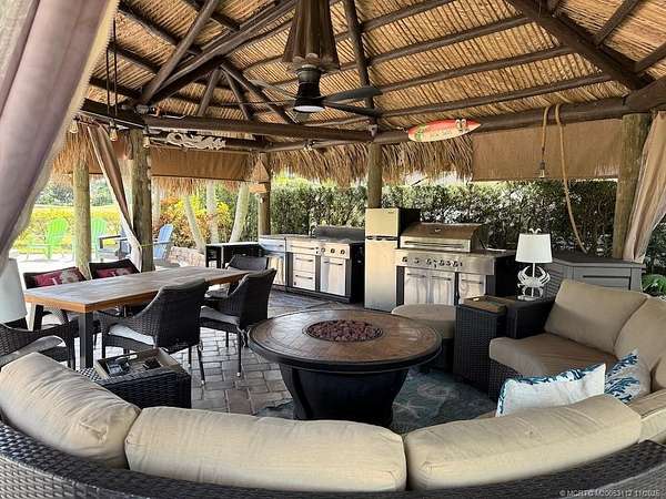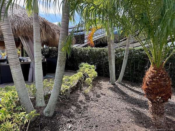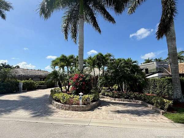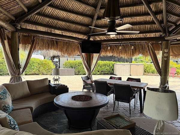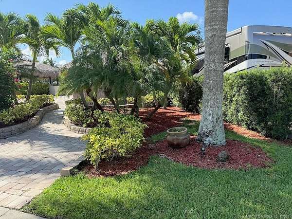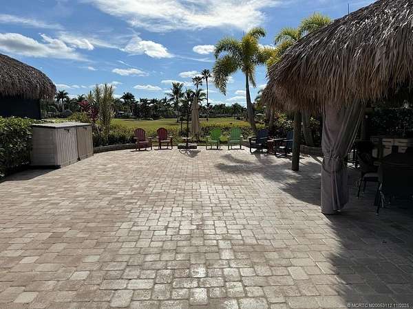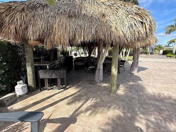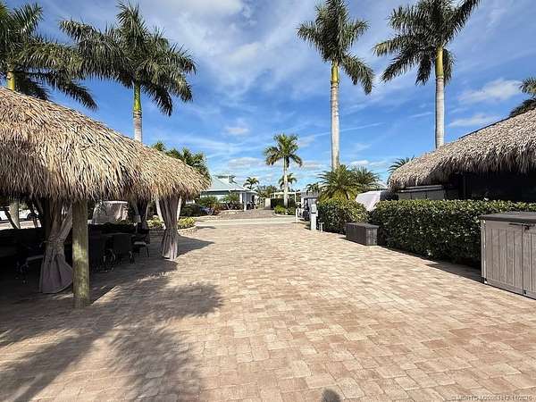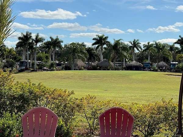 Beautiful, large pull in lot overlooks the rolling hills of the golf course. Fully pavered with wide frontage that includes separate golf cart parking! Large tiki with modular, granite topped kitchen featuring built in grill, sink, etc. and apartment sized refrigerator. All tiki poles and support beams have been stained providing that "upscale" tropical feel and there's an attractive center pole support for the ceiling fan. Full eisenglass curtains completely enclose the tiki. Most furnishings remain including a new sofa set purchased in the spring, tv, Adirondack chairs etc. There's plenty of room for entertaining both inside the tiki area and out. Meticulous and move in ready! Golf cart available separately.