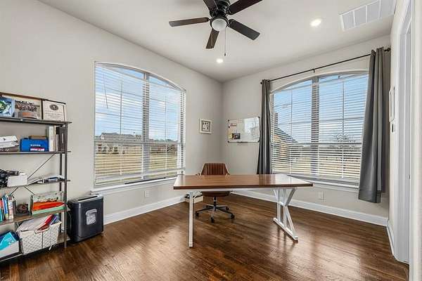 Horses allowed! Beautiful and functional 5-bedroom, 3.5-bath home situated on 2.2 acres in the highly sought after Aledo ISD, offering a perfect blend of luxury, comfort, and functionality. The added breezeway connects the main home to the new office suite, providing ample covered parking while enhancing the property's overall style & elegance. The kitchen highlights granite counters with a stone backsplash, tile floors, stainless steel appliances, tall cabinets with glass doors & a large pantry. This spacious home features hand-scraped hardwood floors throughout the main living areas & a functional open floor plan with tall ceilings, a stone fireplace, crown molding, ideal for everyday living & entertaining & room for everyone. The primary suite serves as a private retreat with tray ceilings with molding, dual vanities & two walk-in closets, while two secondary bedrooms are connected by a Jack-and-Jill bathroom. A fourth bedroom with an en-suite bath is perfect for guests & the fifth bedroom offers flexibility as an additional office or flex space. Utility room with cabinets & granite counters. The dedicated media room provides a true home theater experience with an attached powder bathroom on the second floor. Outdoor living shines with a covered back porch featuring a wood burning fireplace-perfect for relaxing evenings or casual lounging, along with a wrought iron fenced backyard ideal for added privacy and enjoyment. The property also includes a separate office space with its own private entrance, ideal for remote work, craft room or a home-based business. This space is equipped with two dedicated 30-amp electrical services, zoned HVAC for IT equipment, private security access & is pre-plumbed for a bathroom--offering potential for a secondary suite or multigenerational living. Situated on a roomy cul-de-sac, this property offers ample space for outdoor activities & the opportunity to fully enjoy the beauty of the land.