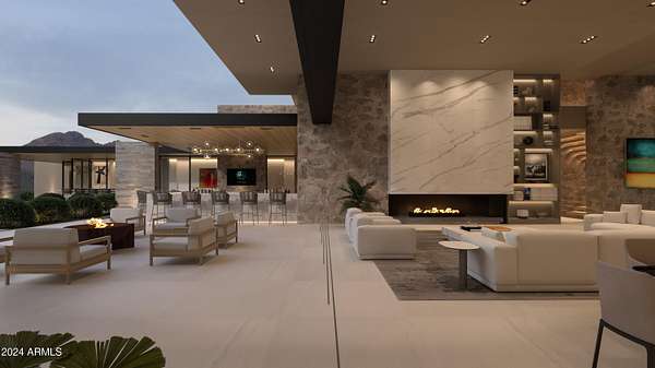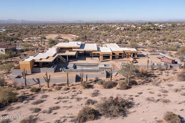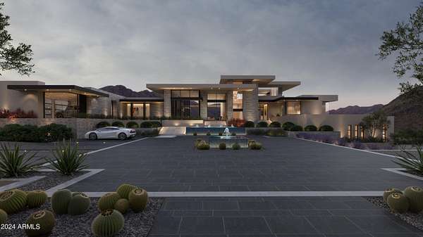 Set on 9.4 acres of the most exclusive and sought-after real estate in North Scottsdale, this private estate is a masterpiece brought to life by Parolo Builders and award-winning architect Stratton Andrews. The design features vertical polished custom block walls that frame breathtaking canyon views of the McDowell Mountains, while sleek, cantilevered steel rooflines create a dramatic aesthetic and generous covered outdoor spaces. A private elevator ascends to the open-air rooftop deck, complete with an entertainment bar, offering unparalleled panoramic vistas. Spanning 11,460 square feet, this gated estate seamlessly blends luxury and functionality. It includes 5 bedrooms, 7 bathrooms, a flex room off the primary suite, a private office, 2 laundry rooms, and a butler's pantry. The estate also boasts an 8-car garage, an expansive great room with a floating fireplace, and a chef's kitchen with double islands. A den or game room, paired with floor-to-ceiling glass walls, creates a harmonious flow between indoor and outdoor living spaces. Designed for ultimate relaxation and entertaining, the resort-style 70-foot pool and spa complete the outdoor experience. George Oliver Design Group has carefully curated top-of-the-line appliances, fixtures, and finishes, ensuring every detail reflects modern elegance and sophistication.