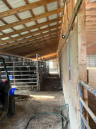When you pull in the driveway to your parking spot, you have the home straight ahead, the arena to the left, and the working sheds to the right.(36x48 and 30x60)You can get out of your truck, and assess the whole farm from this vantage point. There are paddocks with steel fencing to the South and barbed wire fences around the farm. There are 3 ponds and a water tank.