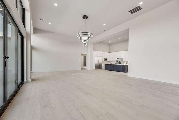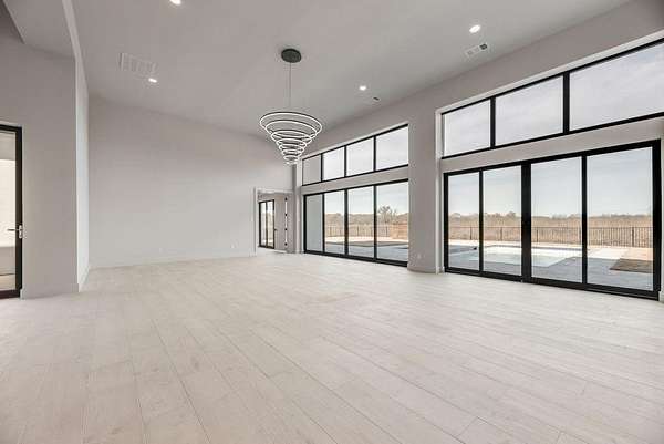 Multiple accordion-style glass doors open to an oversized covered patio overlooking a sparkling pool and hot tub, delivering seamless indoor-outdoor living. With its grand scale, refined finishes, and effortless flow, this one-story mansion blends resort luxury with everyday ease--all on one spectacular level.