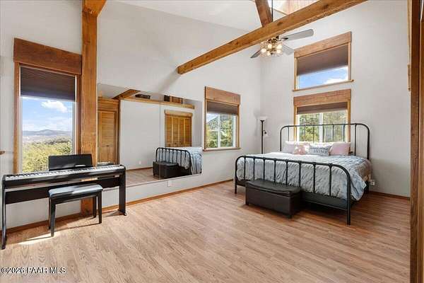 Nestled at the base of THUMB BUTTE on 2 acres and along the National Forest, this one-of-a-kind retreat offers unparalleled privacy and unobstructed views of one of Prescott's most distinguished landmarks, along with sights of Prescott City, the San Francisco Peaks, and additional scenery. The rustic charm combined with the stunning views creates a timeless atmosphere. Relax and take in the beauty from the exceptional wrap-around deck. The sale includes an adjacent lot that is also buildable. This property is ideal for a VRBO, a second home, or a multitude of other possibilities!! It features 2 bedrooms, 2 bathrooms, high ceilings, wooden beams, upgraded bathrooms, New Windows, New HVAC System, New wrap around Trex deck, New exterior paint and more. Located just steps from the trails of the Thumb Butte National Forest. Home comes fully furnished. This is truly a gem. Owner/Agent
