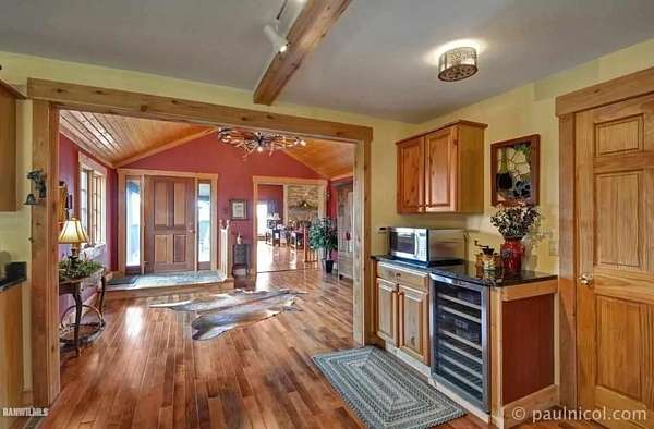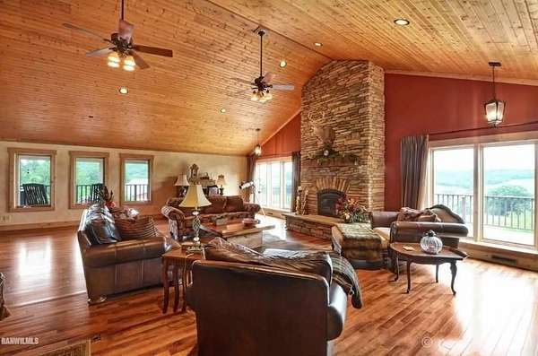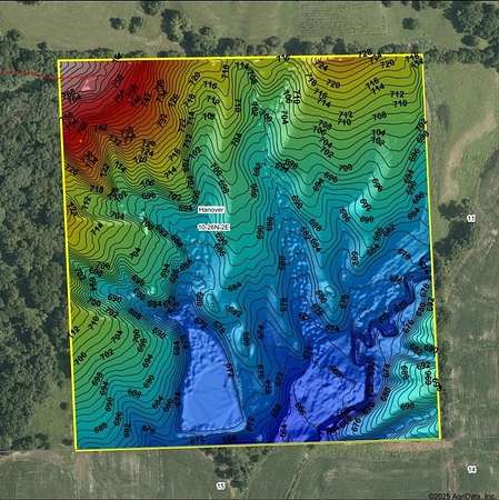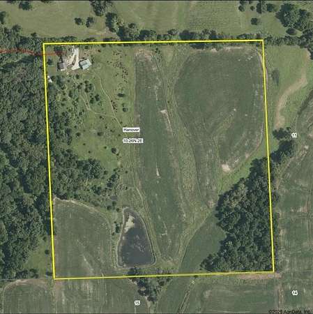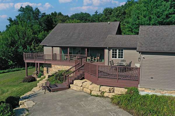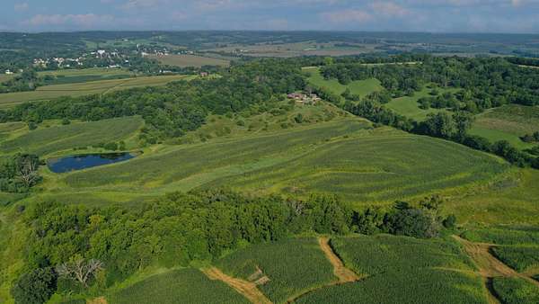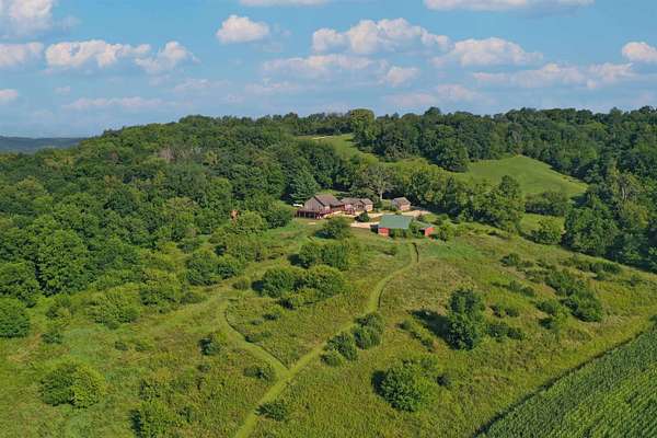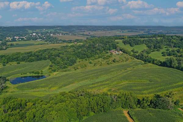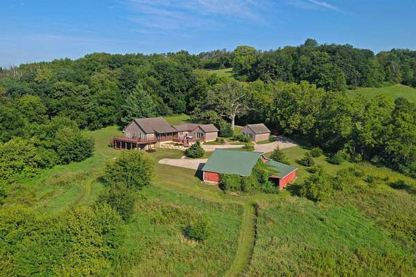 Take note of one of Jo Daviess County's most premier properties- this rustic contemporary home features luxurious finishes throughout, incredible panoramic views of the southern sky, unmatched privacy and room to roam with 43.26 +/- country acres including your own private stocked pond nearly 2 acres in size. Set down a paved lane, this 3 bedroom walkout ranch home boasts nearly 3,300 square feet of living space and has been maintained to a level that feels like new construction. Step into a large foyer that flows perfectly into a jaw dropping great room with warm wood clad vaulted ceilings, a floor-to-ceiling stone surround fireplace, and a wide open lodge like feel with large windows that offer a vantage of the entire acreage and beyond. High end finishes can be found throughout including engineered hardwood flooring on the entire main floor, granite countertops, stainless appliances, and custom cabinetry in the kitchen; and a dining room also featuring vaulted wood clad ceilings and direct access to a deck off the south end of the house. Rounding out the main floor is a full bathroom with a walk-in tiled shower and granite double vanity, and a large mudroom with direct access to the rear of the house. The lower level features all three bedrooms, and a massive and impressive master bathroom with a large walk-in shower, a soaking tub surrounded by stone accent walls, and a double vanity with granite tops. The additional bedrooms share a Jack and Jill style full bathroom with one of the bedrooms, as well as the master, having direct access to a lower level deck via walk out doors. An additional guest house/in-law suite is a separate structure sitting just to the east of the house with an additional 520 square feet of living space including an open sitting area and kitchenette with granite countertops and custom cabinetry, a cozy lofted sleeping space, and a full bathroom with double vanity and tiled walk-in shower. A large barn with newer metal roofing adds to the country charm but also services as a functioning space for a garage and storage for all of the property maintenance and recreational equipment. Mowed paths make for an easy walk from the house down to the nearly 2 acre stocked pond on the south end of the property. The remainder of the acreage consists of approximately 24 productive tillable acres that produce enough cash rent income to offset most of the property taxes, with the balance being in beautiful hardwood timber plentiful with wildlife. Between fishing in the ponds and being located in one of the highest deer and turkey density locations in the area, this property is an outdoor enthusiast's dream! Not to be overlooked is the fact that the property lies adjacent to the Village of Hanover meaning it is a rare opportunity that a new owner could own a country property that could be annexed into the Village for a more favorable zoning jurisdiction. This means the property could likely be used and succeed as a high end short term rental vacation property. The property is being offer mostly furnished with few exceptions, making it truly a turn key opportunity for it's new owner. This property must be seen firsthand to truly appreciate, so schedule your private viewing today! Buyers must be prequalified or provide verification of funds for showings. Boundaries in listing photos are for reference and do not represent an exact boundary survey.