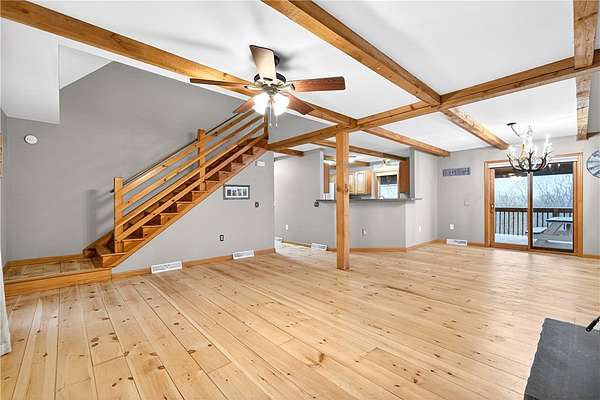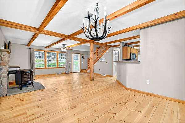 Enjoy rustic charm in a beautiful open concept 4 bedroom, 3 full bath home on 10 serene acres. Cul de sac street. Enter to a vaulted entry w/ open floor plan. Living room/dining room combo features gorgeous wide plank pine floors and wood burning stove. Chef's delight kitchen w/ gas or electric option and plenty of counter space. Owners Suite on main level. 2 oversized bedrooms and full bath on upper level w/ plenty of closet space. Finished basement with metallic epoxy floors and full bathroom adds tons of space to this home. 2 car attached garage and lower level garage. Spacious covered deck runs the length of the house and overlooks the private backyard and barn. 5 stall barn with tack room & hay loft (built 2020). Cross fenced into 3 pastures. Perfect for horses, livestock or hobby farming. Chicken coop set up w/ electric. Enjoy a peaceful country setting w/ plenty of space to live, work & enjoy nature in this well built home. Public water w/ sand filter septic system.