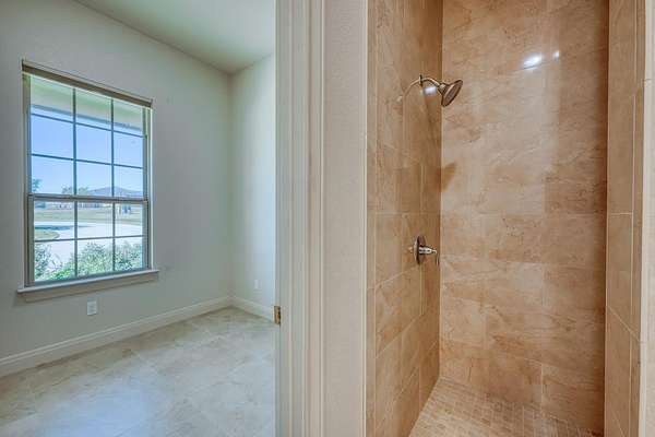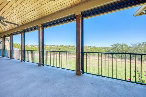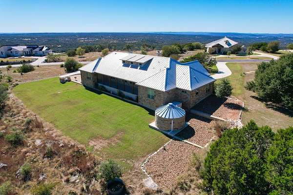 Custom Southern Living inspired single-story home on nearly 3 acres in the highly desirable gated community of Eagle's Nest. This thoughtfully designed double-primary suite layout offers 4 bedrooms, 3.5 bathrooms, plus a dedicated office -- ideal for multi-generational living or long-term guests. The main living area is warm and welcoming with wood-beamed ceilings, beautiful hardwood flooring, a wood-burning fireplace, and expansive windows that capture panoramic Hill Country views. The kitchen, breakfast nook, and butler's pantry flow effortlessly together and feature custom cabinetry, high-end appliances, a gas cooktop, and an oversized walk-in pantry. One primary suite is ADA compliant, located near the laundry room for convenience. The laundry room includes abundant storage and direct access to the rainwater collection control system. This home is served by both city water and rainwater. The main primary suite is privately tucked away with a large walk-in closet with custom built-ins and a serene spa-like bathroom with heated floors, walk-in shower, soaking tub, quartz countertops, heated towel rack, and plumbing ready for a second sink if desired. Additional features include a side-entry 2-car garage with stair access to a fully decked and insulated attic, circular driveway, lush landscaping and fully irrigated front and back yards. The long covered front and back porches are perfect for enjoying the sweeping Hill Country views -- this 2018 built home is truly spectacular. Find yourself at home here!