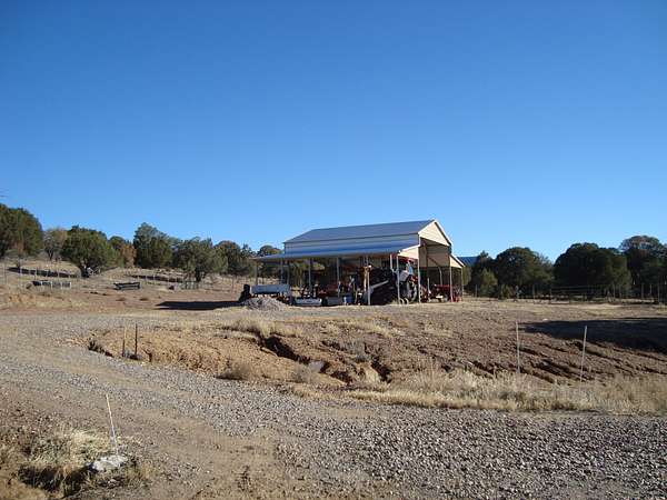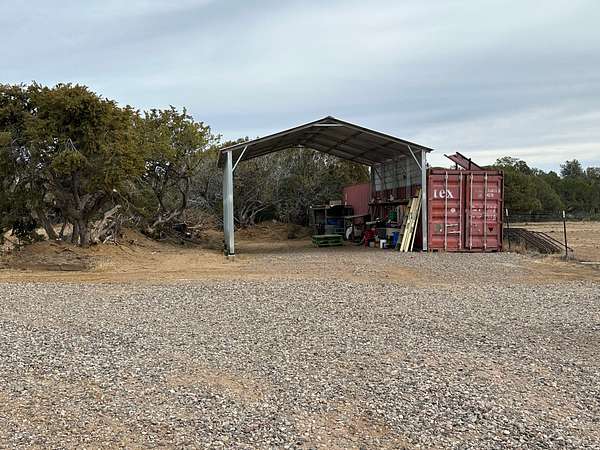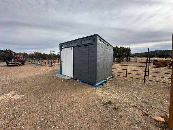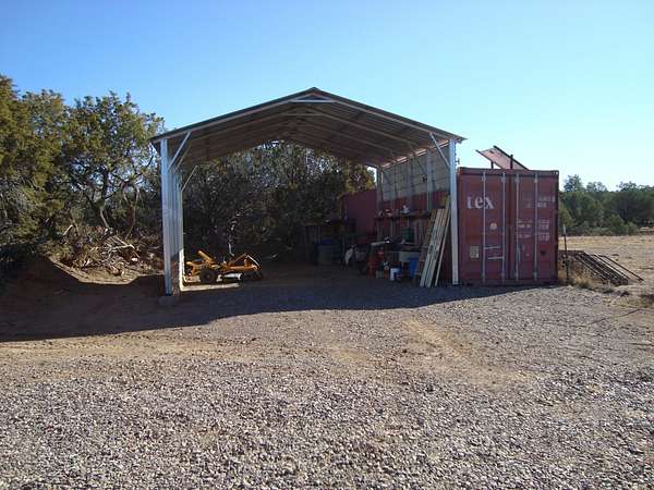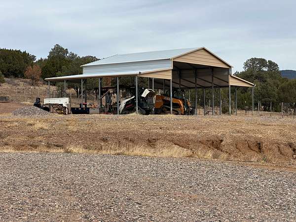 Additional improvements include a 30.5' x 20.5' workshop with covered garage, ideal for an ATV or side-by-side. Ranch structures consist of an A-frame barn package (50' x 26' x 12') featuring 12-10-8' legs, a center height of approximately 30', rated for 140-mph winds and 30 lb ground snow load (non-sustained). Supporting structures include a 20' x 20' covered shelter, a 40-foot extra-tall (9') storage container equipped with solar lighting and outlets, and an 11' x 7' x 7' feed shed for feed storage.