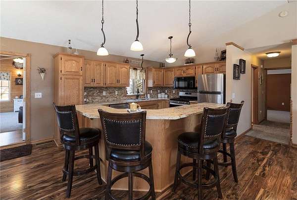 This stunning home offers the perfect blend of modern updates, spacious living, and peaceful privacy on a generous 1.64-acre lot with no immediate backyard neighbors--your own serene retreat awaits. Step inside to the bright and inviting main floor, where the generous sized foyer leads to the heart of the home. The kitchen boasts sleek granite countertops, a stylish tiled backsplash, a large center island with raised breakfast bar for casual meals or entertaining, and newer appliances that make cooking a joy. The huge dining space is perfect for family gatherings, complete and the built-in bench featuring handy side storage provides great character. The main floor laundry room includes a convenient half bath and is thoughtfully located right off the garage for easy access. The living room features a cozy gas fireplace and three walls of windows that flood the space with natural light while offering peaceful views of the private backyard. Head downstairs to the walkout lower level, which expands your living options with a large family room anchored by another fireplace and is ideal for movie nights or game days. There are an additional two bedrooms, a 3/4 bath, and abundant storage space for all your needs. Outside, enjoy the expansive 30x24 detached garage for extra vehicles, workshop, or storage, sprinkler system, plus the rare privacy of 1.64 acres backing to open space. Recent major updates include a brand-new furnace (2025) and air conditioning less than 5 years old, ensuring comfort and efficiency year-round. This move-in-ready gem combines thoughtful design, ample room to grow, and tranquil surroundings.
