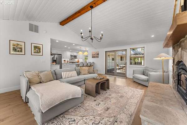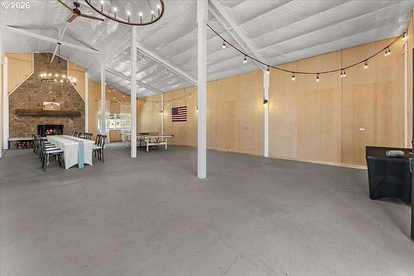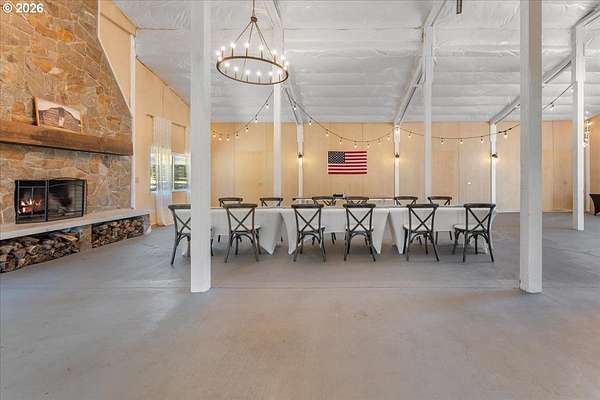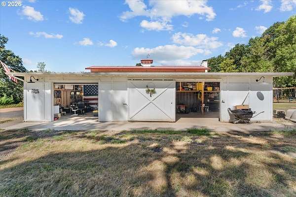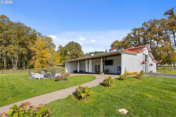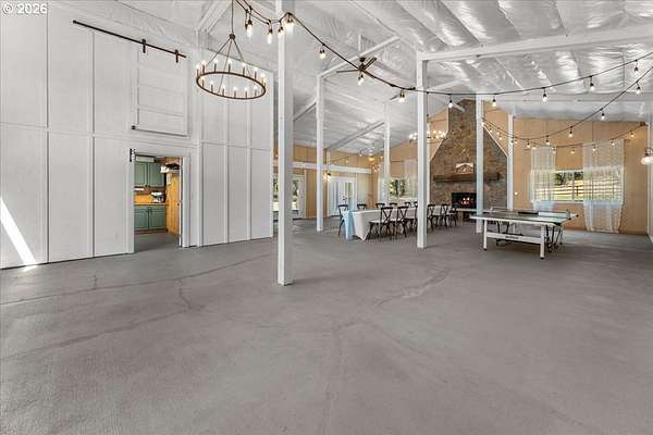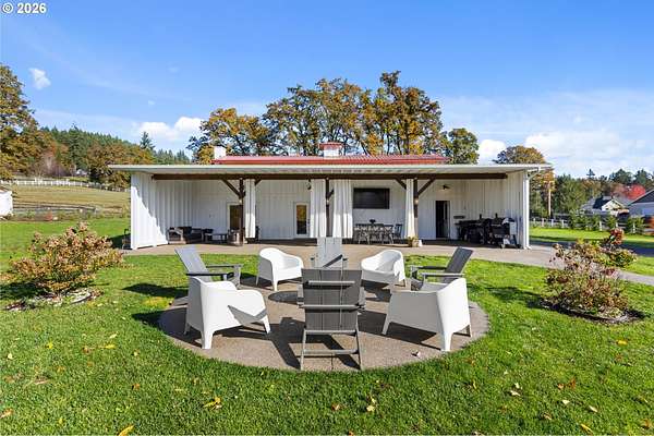 Welcome to this beautifully remodeled one level ranch, nestled on 4.96 private acres. This turnkey home offers comfortable one level living with a brand new kitchen, bathrooms, flooring, appliances, interior doors, and fresh paint inside and out, blending charming farmhouse style with peaceful surroundings. Step outside to enjoy a beautiful backyard featuring a spacious patio and a relaxing jacuzzi, perfect for unwinding or entertaining. The property also includes a stunning barn with 1,728 square feet of flexible space, highlighted by a dramatic floor to ceiling wood burning fireplace, a full kitchen, one bathroom, a two car attached garage, and a dedicated storage area. An inviting covered patio with extra seating and a cozy fire pit makes the space ideal for gatherings under the stars. A rare opportunity to own a unique property that blends comfort, function, and charm, do not miss it. The home also includes a convenient mother in law suite with its own fridge, stovetop, bathroom, and private entrance, ideal for guests or extended family.