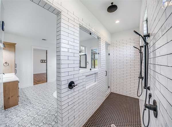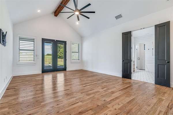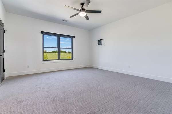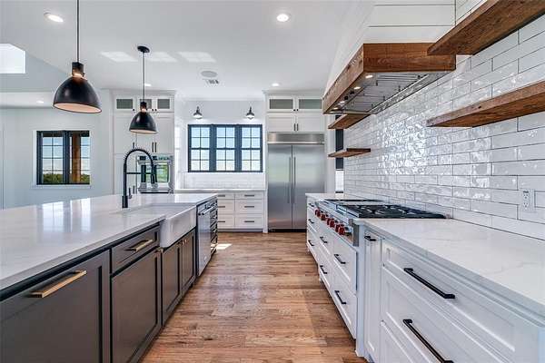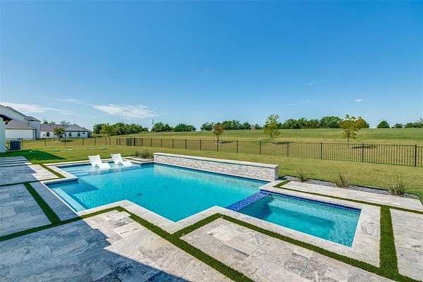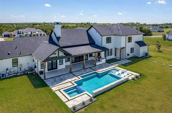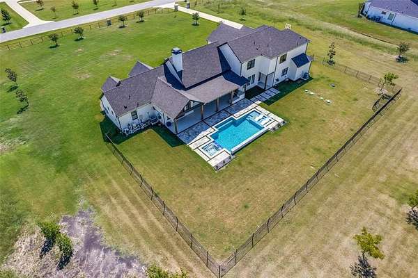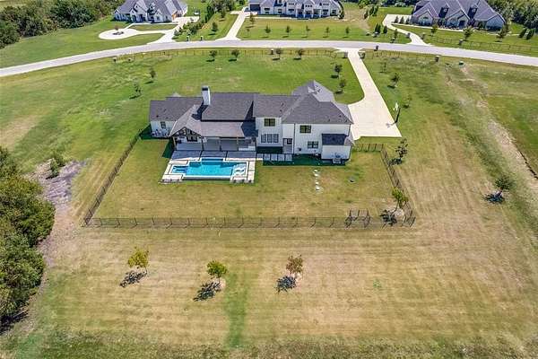 Enjoy the serenity & privacy of your own slice of a Texas ranch, all while maintaining a strong sense of community. This beautiful 5-bedroom, 4.5-bath home is ideally situated on 2.2 acres. Upon entering through the double doors, you'll be greeted by a light-filled Great Room where attention to detail & design is immediately evident. The modern aesthetic of white counters & walls contrasts beautifully w black cupboards & woodwork, while warm wood floors & beams provide a traditional touch. This spacious room, large enough to accommodate additional dining, features a cozy fireplace & a wall of windows overlooking the tranquil, oasis-like backyard. The kitchen, open to the Great Room, is a chef's dream with a 6-burner Wolf Range, double ovens, a built-in refrigerator, & a farmhouse sink. Ample kitchen storage is further enhanced by an extra-large pantry. An attached Breakfast Room & Breakfast Bar offer plenty of space for casual dining. The 1st floor Primary Bedroom boasts panoramic views of & direct access to the pool area, complete with a convenient coffee bar & drink refrigerator. The Primary Bath is a luxurious retreat, featuring a free-standing tub & a double shower. Remarkably, a discreet safe room is tucked away within the Primary Suite. A dedicated study is located adjacent to the Primary Bedroom, & another 1st floor bedroom w an en-suite bath provides privacy for guests. The 1st floor is completed by a Media Room, a separate office space, & a utility room. Upstairs, you'll find a light & airy space offering three additional bedrooms, two baths, & a spacious Game Room. Step outside to discover an inviting outdoor living space with a covered patio & a built-in grill. Your private resort is complete with a tanning deck in the pool, a relaxing spa, & an elegant water feature.