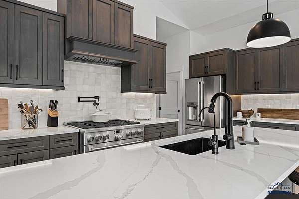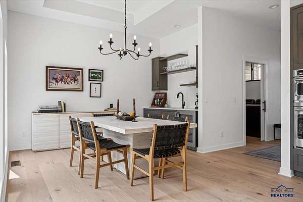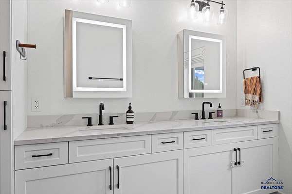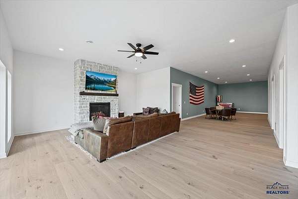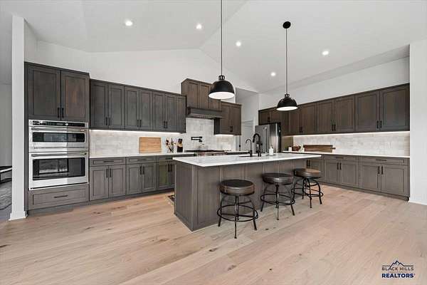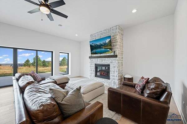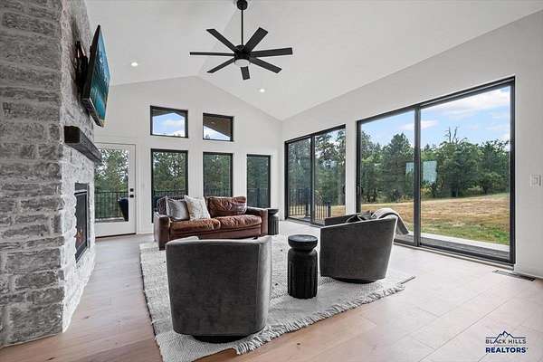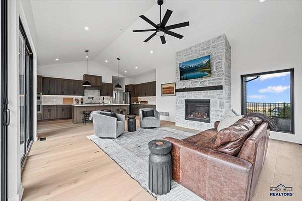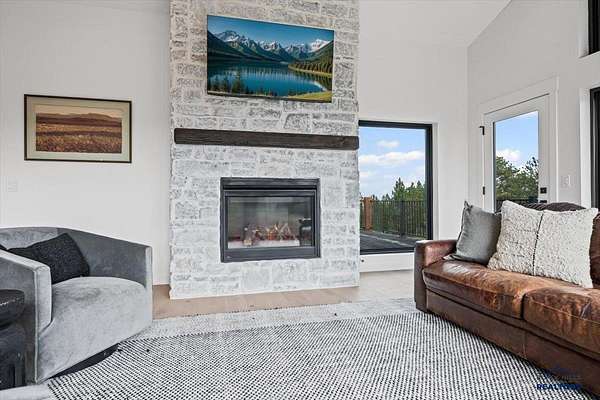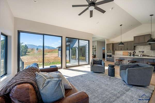 Motivated seller due to relocation, all offers will be considered. Seller offering $30,000.00 landscaping allowance. Listed by Jenni Sneesby - 605.645.1181 - Engel & Volkers Black Hills. Welcome to a custom-designed ranch home offering approximately 3,800 sq ft of living space on just over 2.6 acres in Cedar Berry Canyon Estates, Spearfish. Completed in 2022, this luxury residence features four bedrooms, three full bathrooms and a spacious four-car attached garage. The executive kitchen boasts a large island with seating, quartz countertops, shaker-style cabinetry with soft-close hinges and a walk-in pantry. Vaulted ceilings and a wet bar enhance the formal dining area. The living room is warm and inviting with gas log fireplace and walls of windows framing views of Crow Peak and the wooded valley beyond. The primary suite includes tray ceilings, a spa-style ensuite bath and walk-in closet with direct access to the laundry room and private covered deck. A full walk-out finished basement offers two additional bedrooms, a family room with second gas log fireplace and wet bar. Step outside to enjoy both covered and open decking plus a ground-level patio for outdoor living, grilling or fire-pit evenings. The landscape features mature trees, panoramic views and peaceful seclusion yet remains just minutes from Spearfish schools and amenities. This home offers upscale finishes, thoughtful layout and generous acreage in an exclusive and picturesque setting.