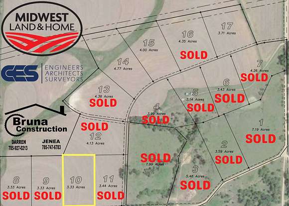 LOTS FOR SALE - Little Blue River Estates Subdivision - Lot 10 Do you desire a small acreage to build your dream home? LOOK NO FURTHER! Little Blue River Estates Subdivision has lots ranging in size from 3.33 acres to 4.77 acres available waiting for you! This development is conveniently located outside Hanover, KS, and reasonably priced at $10,000 per acre. It offers the perfect pair of serene country living with the convenience of living close to town. Legal Description: Little Blue River Estates, S07, T02, R05, ACRES, Lot 10, Little Blue River Estates LESS RD ROW, Washington County, Kansas Property Location: From Hanover, KS head West on Hanover Avenue half mile to Yankee Road. The intersection of Hanover Avenue and Yankee Road is the Northeast corner of the property. Available Lots: 10 - 3.33 Acres Attributes: Currently outside city limits No HOA Custom stick built homes (no modular or prefabricated homes) 1,800 square feet minimum of living space on the main floor Up to 3,000 square feet of out building space allowed No animal restrictions (must be fenced or caged) No exclusive builder Utility easement Amenities: Electric - Bluestem Gas - Propane Rural Water Internet - BlueValley Technologies Sewage - Septic or Lagoon Pictures and property lines are illustrations only and not guaranteed to be actually property lines.