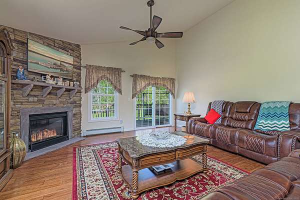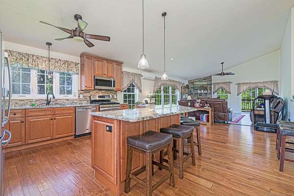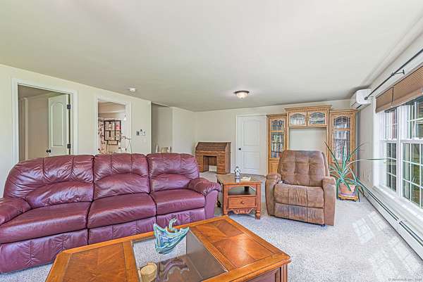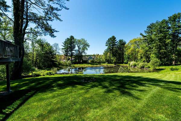 This beautiful ranch style home features over 2500 square feet of living space, and it is set on a beautiful 1.92 acre property with a private pond. The bright, open main level has a custom kitchen with a very large island, granite counters, tile backsplash, and stainless appliances. There is a spacious living room with a stone fireplace and sliders to the back deck, and a lovely formal dining room. The primary suite opens to the back deck, and has a walkin closet and a full bath with a tile shower and a soaking tub. Also on the main level is a second bedroom, a half bath, and a laundry/mud room. The finished, walkout lower level has a large family room, a bedroom, and a full bath. There is also a large unfinished section of the basement for storage and possible future expansion of the living space. Features include air conditioning with 3 mini-split units, vaulted ceilings, and energy efficient propane heat. There is a private, paved driveway, underground utilities, private well, and public sewer. Great cul-de-sac location, with easy access to local amenities such as shopping and restaurants, and easy commuting to the highway and to Rhode Island locations. This property is in immaculate, move-in condition. Be in your new home this summer!
