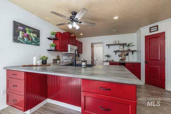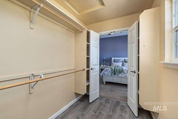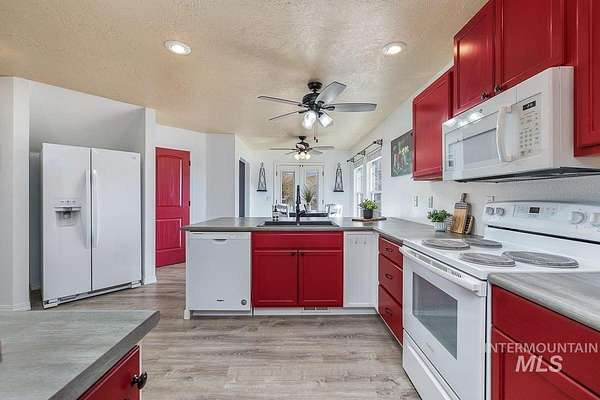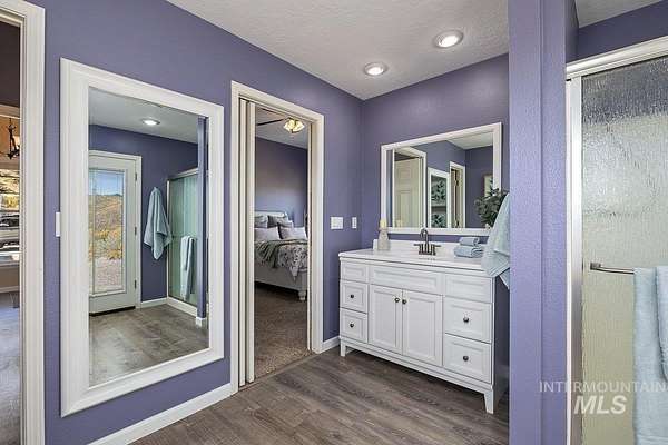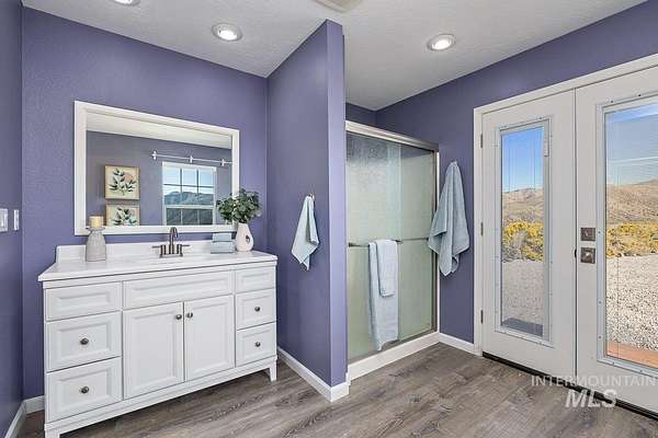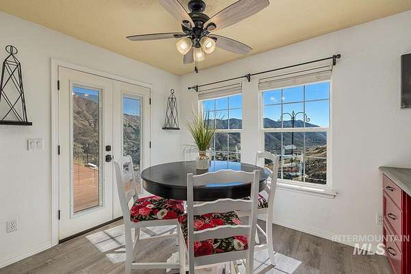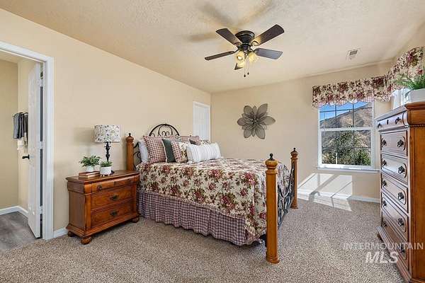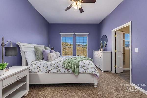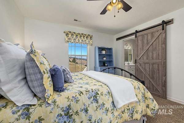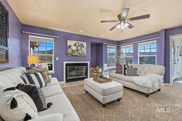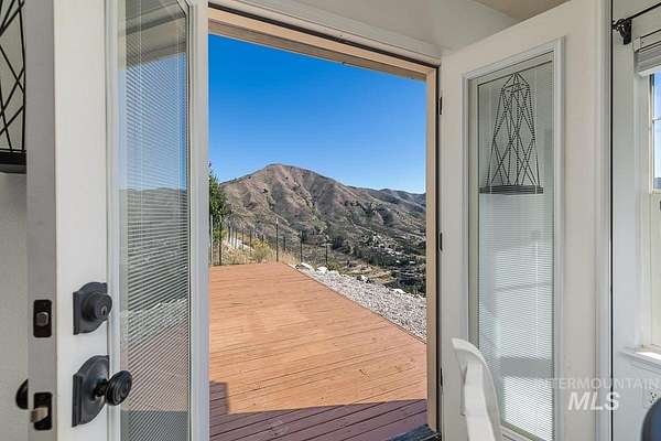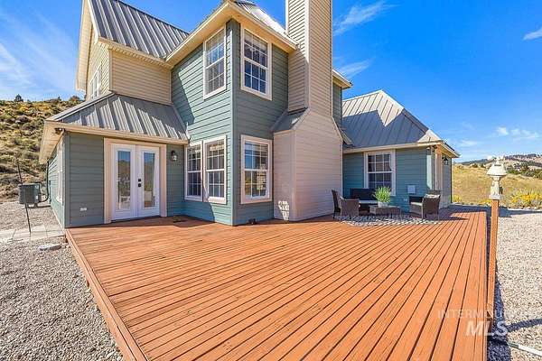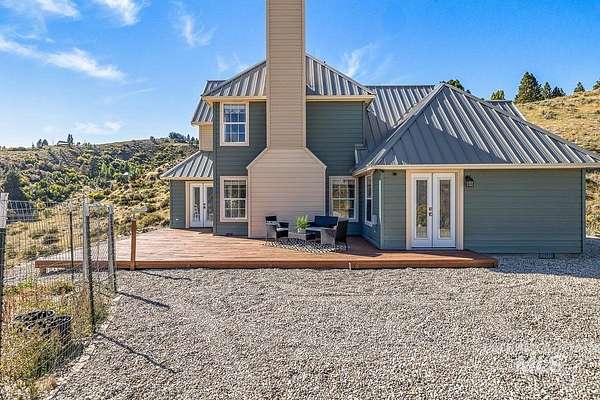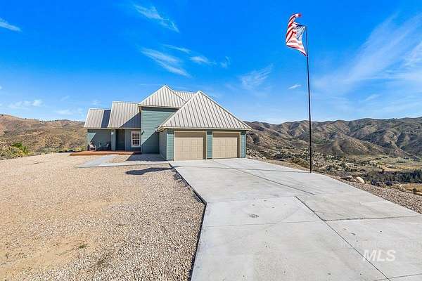 Welcome home to your very own private retreat or investment property perfect for an Airbnb or Vrbo on 5.42 acres which offers stunning 360 degrees views, peace, and privacy-just 35-40 mins from downtown Boise. Enjoy the spacious living room with a cozy wood-burning fireplace, built-in wood storage, and abundant natural light throughout. The main-level primary suite features tall ceilings, private patio access w/ French doors, large walk-in closet with built-ins, Bluetooth speaker, and a walk-in shower. Each bedroom includes a walk-in closet and ceiling fan, and a Jack & Jill bathroom upstairs blends comfort and functionality. The kitchen offers a butler pantry, storage closet, breakfast bar, all electric utilities and direct patio access w/ French doors to the newly painted deck for easy indoor-outdoor living and entertaining. The upstairs loft adds versatility and extra space. The fully equipped laundry room includes a washer, dryer, sink, hanging rod, and storage for added convenience. This charming home also has a 14x14 shed with loft, fenced garden with a peach tree, metal roof, Blink security system, newer heat pump, added attic insulation, new exterior paint, newer flooring, and an oversized front porch to view the abundant wildlife and mountains!