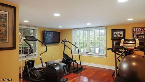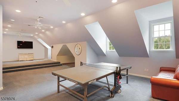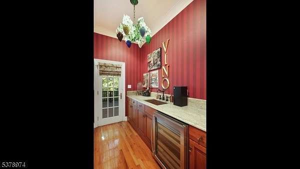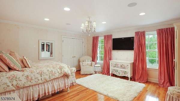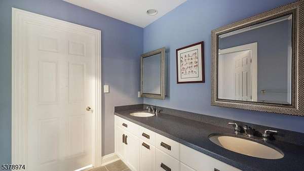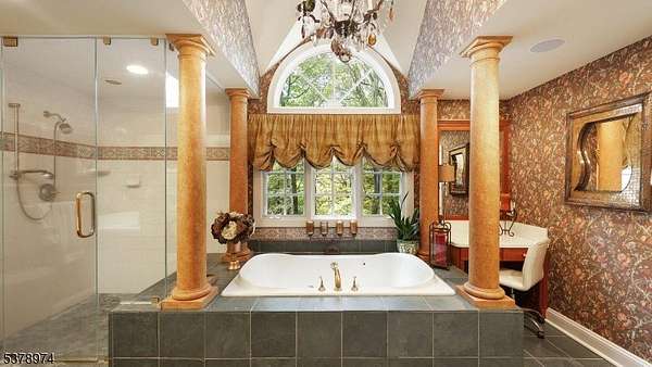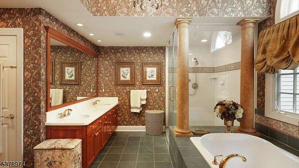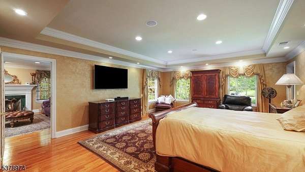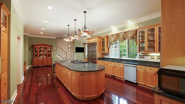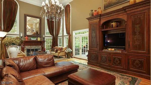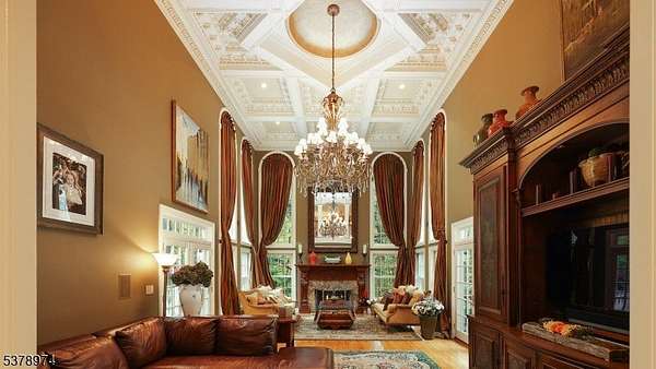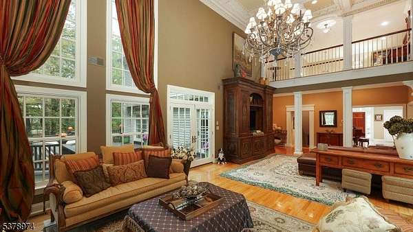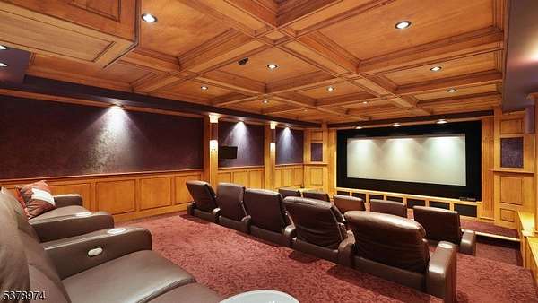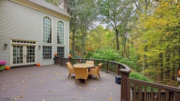 Nestled on over 7+ acres in a tranquil cul-de-sac, this exquisite Bernardsville estate blends timeless elegance with modern luxury and exceptional craftsmanship. A grand two-story entry showcases elegant marble flooring with mosaic tile and spacious coat closets. The living and dining rooms feature rich hardwood floors with decorative inlays, sophisticated tray ceilings, and custom millwork. The gourmet kitchen offers custom wood cabinetry, granite countertops, Viking and KitchenAid stainless steel appliances, and a large center island with breakfast bar. Enjoy seamless indoor-outdoor living through the vaulted breakfast room with French doors to the terrace. The family room impresses with a coffered ceiling, hand-painted gold foil dome, mahogany fireplace, and floor-to-ceiling windows leading to both patio and deck. The home boasts multiple luxurious bedrooms with ensuites, a custom library with cherrywood detailing, and a powder room with marble finishes. Entertainment is elevated with a handcrafted cherrywood bar, recreation room, exercise room, and a professionally designed home theater with stadium seating and state-of-the-art soundproofing. Outdoors, relish the heated Gunite pool and spa, koi pond with waterfall, bluestone terrace, IPE wood deck, and meticulously landscaped perennial gardens. Convenient to schools, shopping, and NJ Transit, this exceptional residence offers unmatched privacy, beauty, and comfort for refined living.