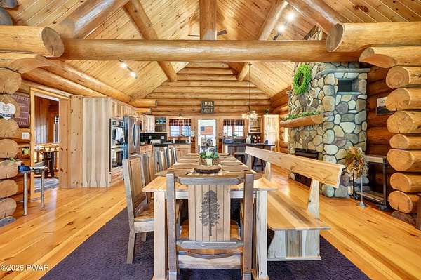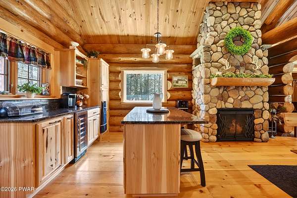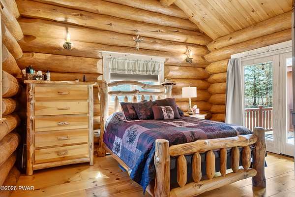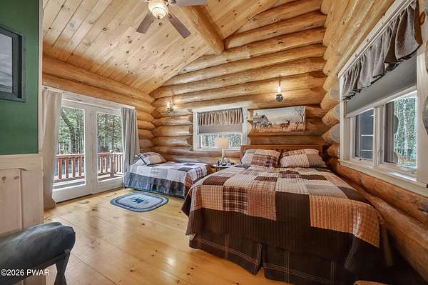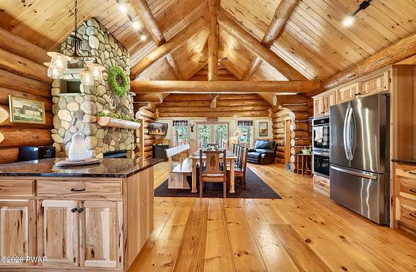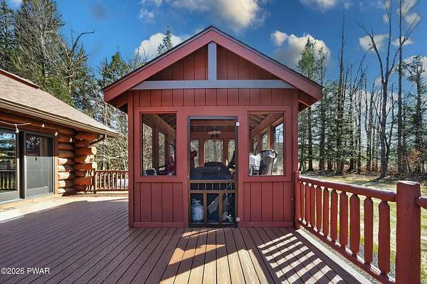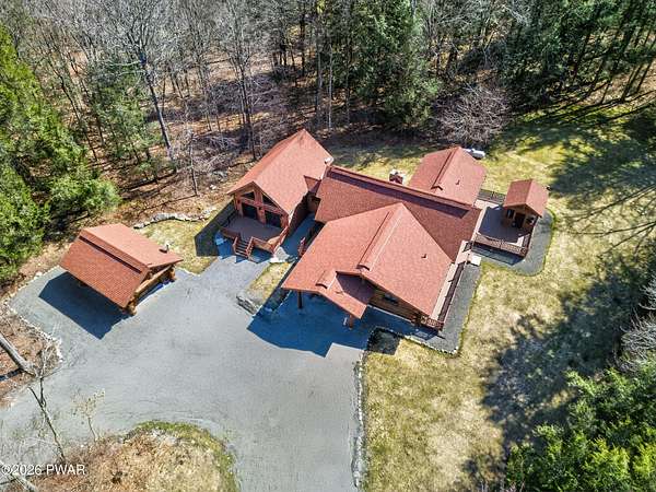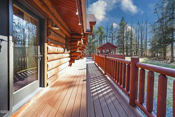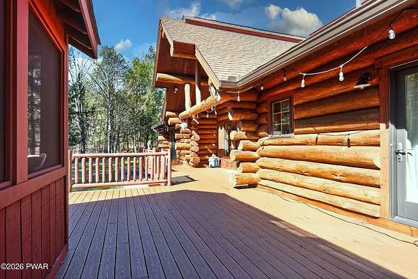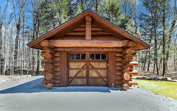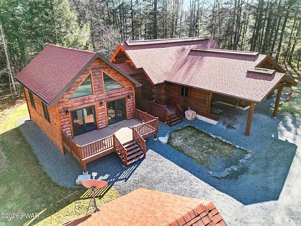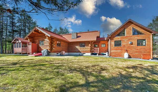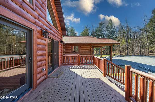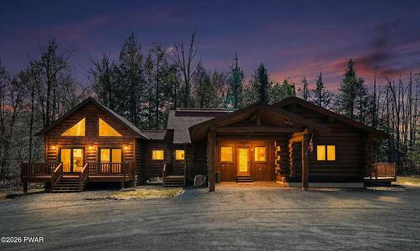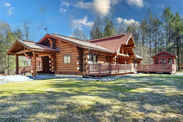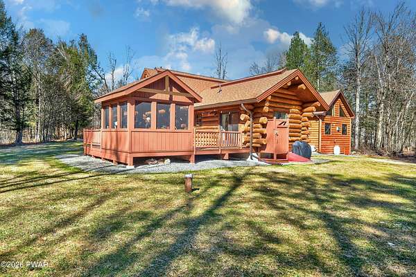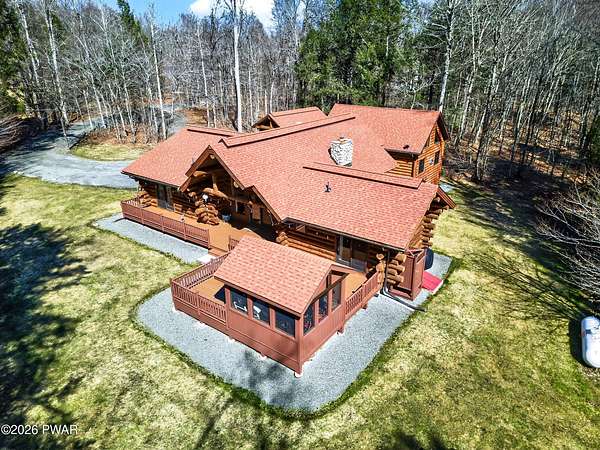 True Log Home on 5.35 Acres with Boat Slip on Motorboating Lake.Welcome to one of the Poconos' best-kept secrets! Tucked at the end of a quiet cul-de-sac inside the gated community of The Woods at Duck Harbor, this stunning true log home delivers authentic mountain living that's nearly impossible to find: raw, beautiful, and completely private.Rich natural log construction, warm softwood pine plank floors, and hand-selected stone accents set the tone throughout. The heart of the home is a spectacular open kitchen and dining room anchored by a soaring stone fireplace. The newly added living room extension impresses with its own stone-faced fireplace, flooding the space with warmth and light. The main level hosts the primary suite, a private log guest bedroom, and a full bath, while the lower level features a family room, three additional bedrooms, a full bath, and laundry room.Outside, nearly 1,000 square feet of deck space wraps the home for entertaining or simply breathing in the trees. A screened-in porch extends the seasons, and a detached log garage adds function and character. The 5.35-acre parcel backs to 120 acres of community green belt, which borders 3,000 acres of Pennsylvania state land, giving you the rare feeling of owning the forest behind you.And then there's the water. A deeded boat slip on Duck Harbor Pond is included, a standout motorboating and fishing lake beloved by the community year after year.The Woods at Duck Harbor is gated, welcoming, and fiercely protected by those lucky enough to call it home. Properties here don't surface often, and 23 Highwood Lane is certainly one special property!