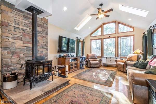 Escape to your own private retreat in this beautiful 4-bedroom, 2-bath custom home set on 2+ peaceful acres. Designed with comfort and character in mind, the home features soaring vaulted ceilings in Living room which also boasts wall of windows and a cozy wood stove that anchors the living area with warmth and charm. The private 2nd floor master suite offers a relaxing sanctuary complete with generous space,sitting room,vaulted ceiling and serene views of the surrounding property. Updated kitchen has separate dining area and sliders to deck allowing you to enjoy the beauty of nature right outside your door!!! This one-of-a-kind property has 3 additional bedrooms on first level,one used as office w/built ins,2 car garage and unfinished basement,paver patio a perfect place to call home!!!.