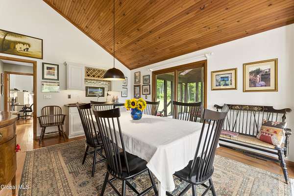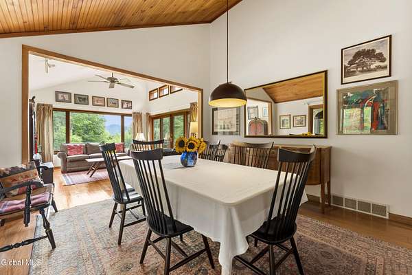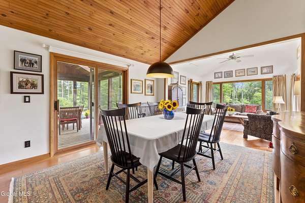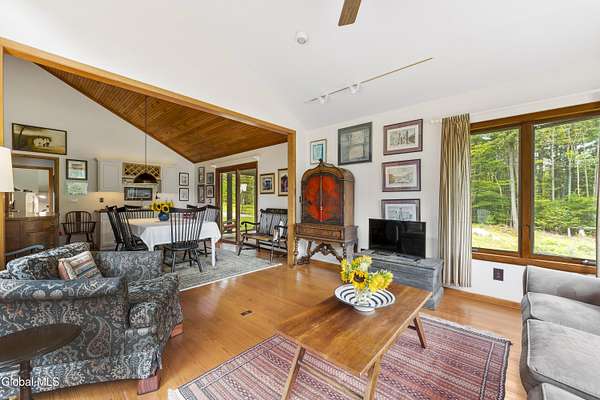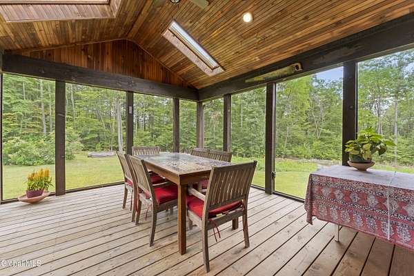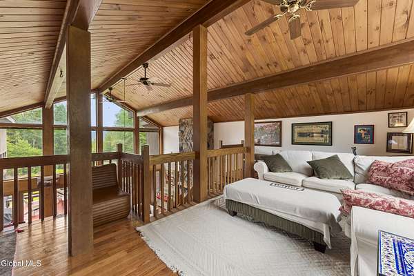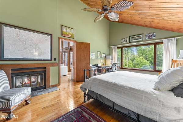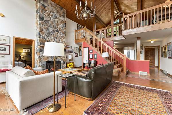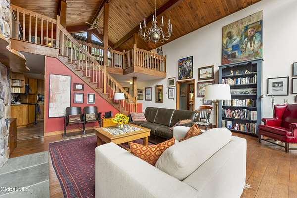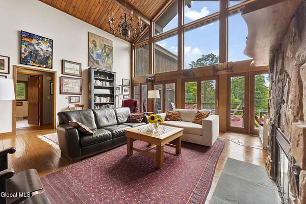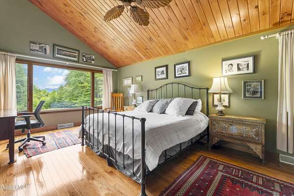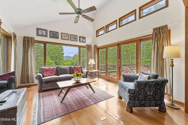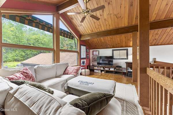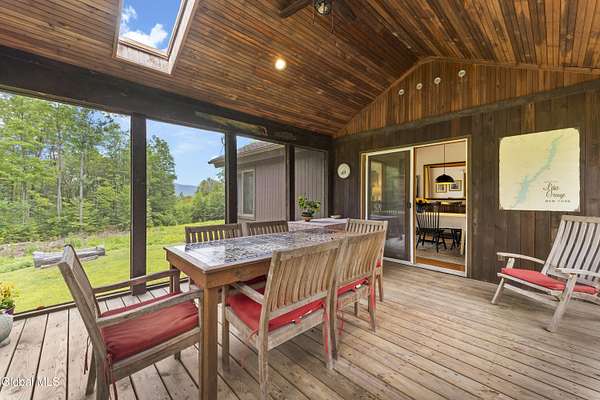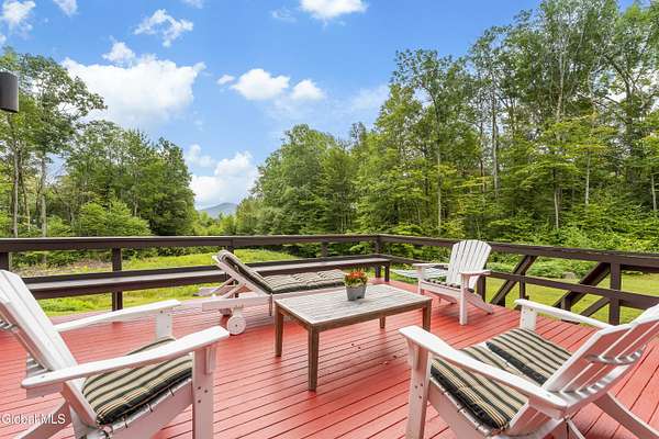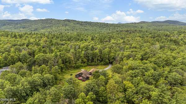 Experience the best of the Adirondacks in this beautifully maintained 2900+ sf home situated on 3.61 secluded acres, just minutes from Bolton Landing, Lake George and Trout Lake. With hardwood floors throughout, this 3-bedroom plus office/bonus room, 3-bath home features a great room with soaring cathedral ceilings, a stone fireplace, and a wall of windows framing breathtaking views of Buck Mountain. An open dining area with wet bar flows into a living room, screened porch, and expansive newly painted deck ideal for entertaining, morning coffee, and soaking in the sunrise. A loft and finished walk out basement provide additional space. Updated bedrooms and baths add modern comfort. The oversized 3-car garage offers practicality for year-round living or weekend getaways. Blending natural beauty, privacy, and convenience, this home is your gateway to entertaining and relaxing while exploring all the Adirondacks have to offer!