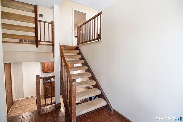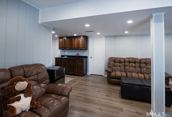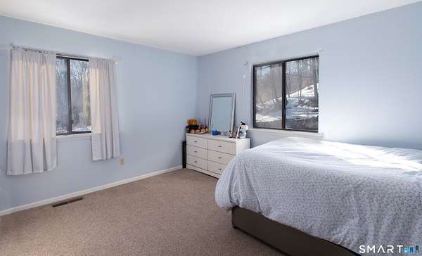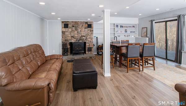 Welcome Home to this Contemporary-style residence privately set on 2.00 acres at the end of a cul-de-sac in sought-after West Mountain Estates. Approached by a private paved driveway and surrounded by mature trees, the property offers exceptional privacy and a beautiful natural setting. This open concept home features a wonderful floor plan designed for comfortable everyday living and entertaining. The vaulted living and dining area is filled with natural light and anchored by an impressive floor-to-ceiling stone wood-burning fireplace. The eat-in kitchen includes a pantry, breakfast area with wall-to-wall windows, and a convenient mudroom. Completing the main level are three well-sized bedrooms and a shared hall bathroom. The tucked-away primary suite occupies the upper level with an ensuite bathroom, ample closet space, private balcony, and a vaulted-ceiling office. The lower level offers a welcoming family room with wood-burning stove, wet bar, half bathroom and a walk-out to the patio. Ideally located in West Mountain Estates with a swimming pool, playground, tennis, gazebo, and more, this outstanding community features many activities, including youth swim team, cornhole league, and "Food Truck Fridays". Only minutes to Ridgefield's vibrant town center, restaurants, shops, theaters, library and museum, and convenient access to various commuting routes to Fairfield and Westchester Counties, and trains to NYC. Welcome Home!