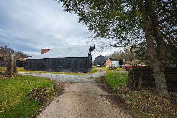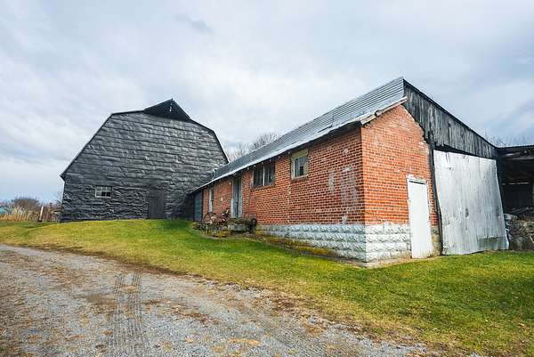 The property has three barns, a brick-and-stone silo, multiple sheds, and outbuildings suitable for equipment and livestock. Fully fenced. Former dairy operation and currently used for cattle grazing.
