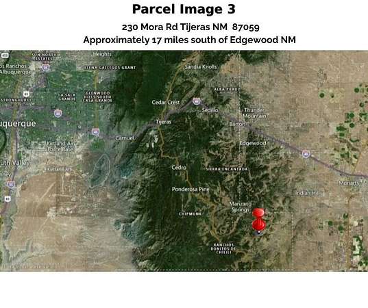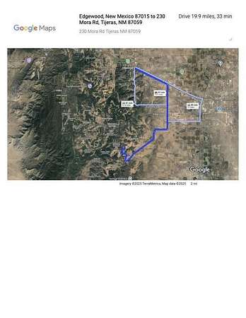 From Edgewood, Follow NM-333 E/U.S. Rte 66 and Lexco Rd to Co Rd A093 in Torrance County, Head south on NM-344 S toward NM-333 E. Use the left 2 lanes to turn left onto NM-333 E/U.S. Rte 66 4.5 mi, Turn right onto Lexco Rd 5.5 mi, Take Moriarty Rd to Mora Rd in Bernalillo County 9.9 mi, Turn right onto Co Rd A093 1.8 mi, Co Rd A093 turns slightly left and becomes Moriarty Rd 5.3 mi, urn right onto Gallegos Rd 1.0 mi, Turn left onto Mora Ln .7 mi, Turn right onto Mora Rd 1.2 mi