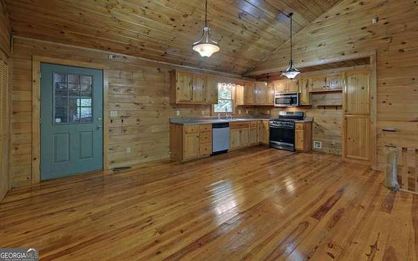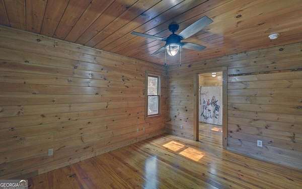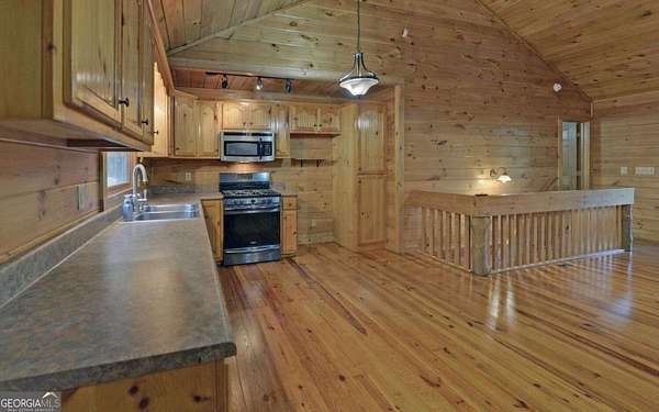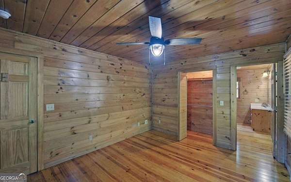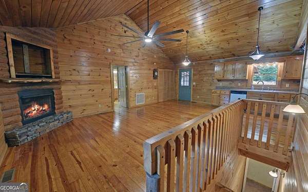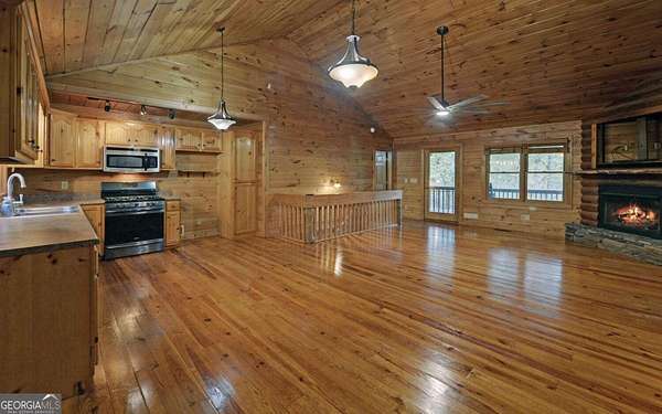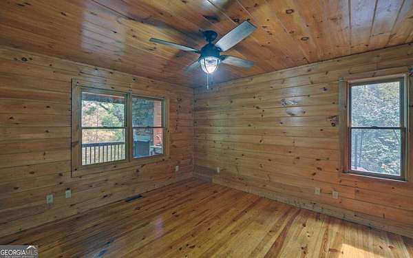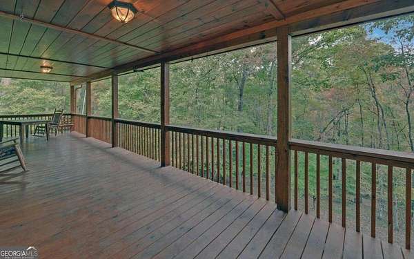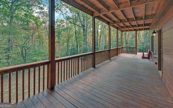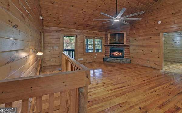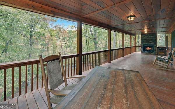 Indulge in the ultimate mountain getaway with this exquisitely appointed luxury cabin, perfectly positioned on over 5 sprawling acres offering unmatched privacy and tranquility. Located just minutes from the charming tri-state hubs of McCaysville, GA, Copperhill, TN, and Historic Blue Ridge, GA. This property defines cabin living. It is an ideal investment for discerning owners or a prime short-term rental opportunity. Step inside to appreciate the warm glow of newly refinished hardwood floors that span the entire open-concept main level, enhancing the cabin's rustic luxury aesthetic. The heart of the home is the expansive great room, featuring soaring ceilings and anchored by a majestic stone fireplace, creating a perfect space for gathering and relaxation. Seamlessly connected to the living area, the kitchen is designed for both entertaining and everyday use. The main level offers unparalleled convenience and luxury with two primary en-suite bedrooms. Each suite provides a private sanctuary, featuring spacious closets and beautifully appointed bathrooms-ideal for multi-couple ownership or accessibility. The fully finished terrace level is dedicated to fun and functionality. An expansive area perfect for movie nights, games, and entertaining guests. Fully equipped wet bar ensures effortless hospitality. A large bedroom and full bath makes this the perfect, comfortable retreat for younger guests. Exceptional Outdoor Living with a massive deck spanning the entire width of the cabin offers stunning wooded views and features a magnificent stone outdoor fireplace-the ultimate spot for al fresco dining and evening conversation. Enjoy the lower private deck as you step out from the game room onto a second large, private deck, ideal for quiet reading or potential hot tub placement (subject to addition).