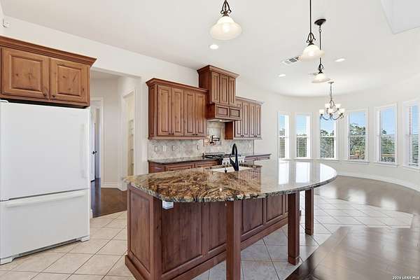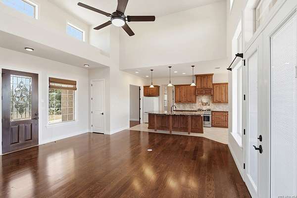 Perched at the peak of one of the highest ridges in the gated community of Dancing Bear Ranch, this exceptional property offers unmatched privacy and breathtaking Hill Country views that stretch for miles. Situated on 3.5 scenic acres, the home captures the beauty, tranquility, and wide-open skies that define true Hill Country living, all while remaining within convenient driving distance of San Antonio. Designed to live like a single story, the thoughtfully planned one-and-a-half-story layout features all bedrooms and bathrooms on the main level, with an upstairs loft or game room that provides flexible space for a media room, home office, or guest retreat. The home has been recently refreshed with updated exterior paint and includes a newly installed back deck, perfectly positioned to take in the sweeping ridge-top views and spectacular sunsets. Energy efficiency is a standout feature, with solar panels helping to reduce utility costs and support sustainable living. Residents of Dancing Bear Ranch enjoy access to outstanding community amenities, including a neighborhood pool, sports courts, and a private lakeside park with a boat launch and pavilion along Medina Lake. Located in Medina County, known for lower property tax rates, this rare ridge-top retreat offers an ideal combination of privacy, efficiency, panoramic views, and the peaceful Hill Country lifestyle.