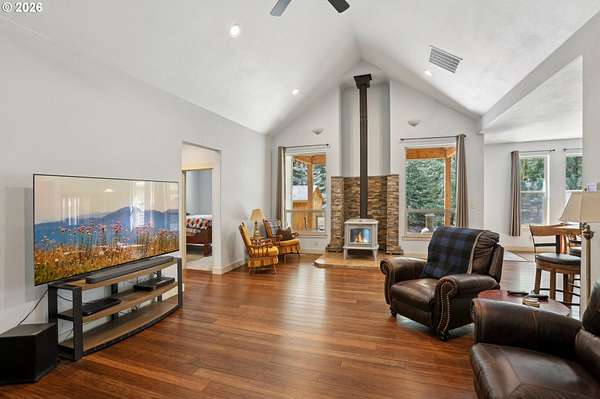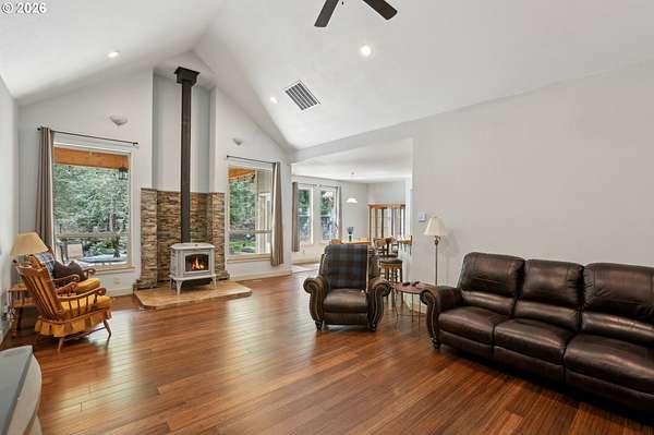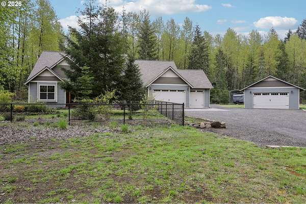 Secluded home with main floor living in scenic Toutle on South Fork Toutle River with access via common area and includes use of the picnic shelter. The property is backed by Weyerhaeuser land. 3 possible 4-bed or bonus room, 2.5 bath with office, and storage area: gated entry, vaulted ceilings, stranded bamboo floor. Features walk-in closet, a large pantry, and a cozy soapstone woodstove. Enjoy wooded territorial views from your large windows. plenty of room in your attached 3-car garage, detached 2-car garage, shop/outbuilding, fenced yard, garden space, and patio. Traditional design offers comfort and privacy with space to relax, entertain, or explore nature. A rare opportunity to own a peaceful retreat with modern conveniences in the Pacific Northwest.