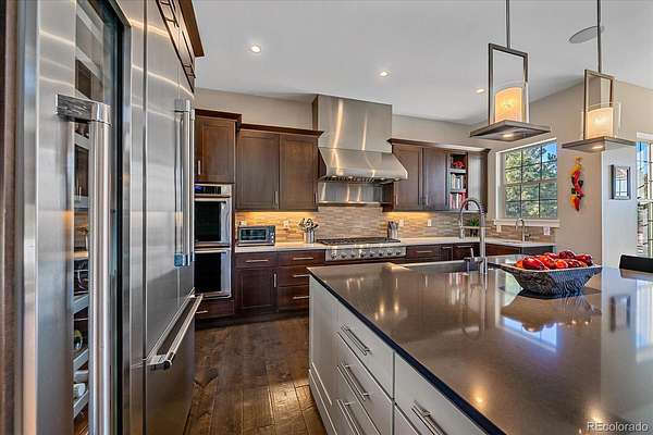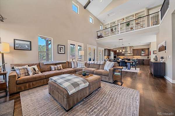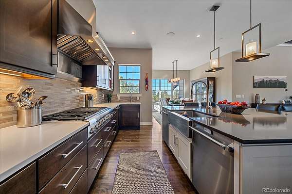 Inside, expansive windows flood the home with natural light while framing serene Colorado landscapes. The open-concept floor plan is designed for both everyday living and effortless entertaining, featuring generous gathering spaces and seamless indoor-outdoor flow. The chef’s kitchen is equipped with premium Thermador appliances, ample custom cabinetry, and a large island perfect for hosting.