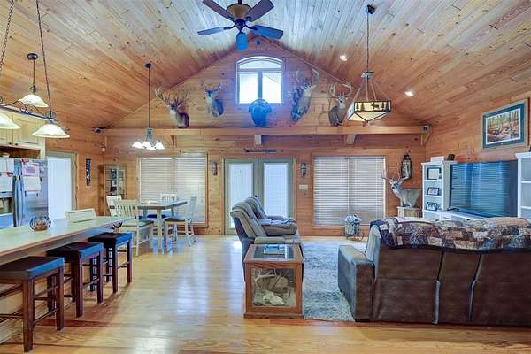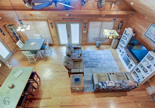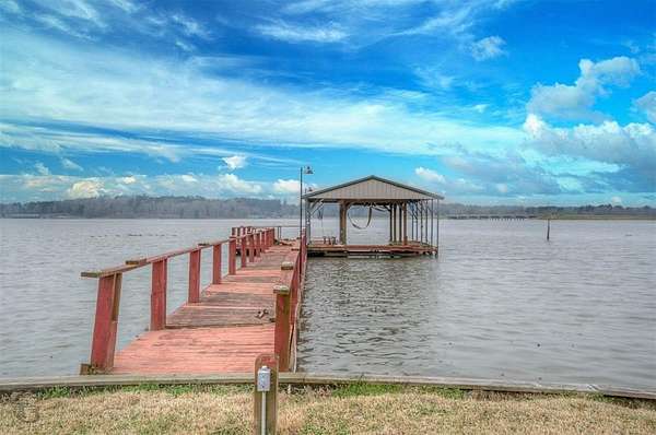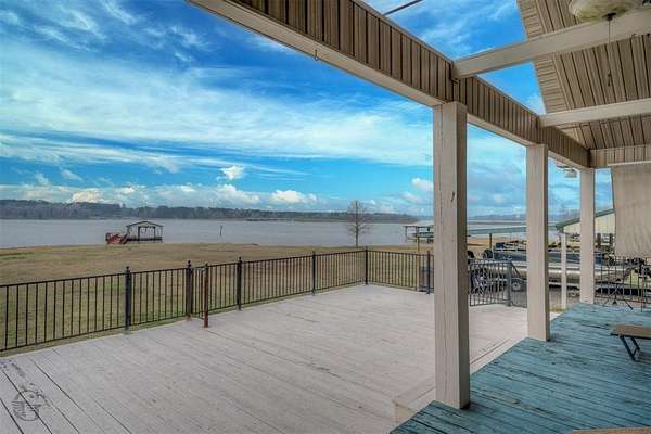 Enjoy gated waterfront living on a prime point at Grand Bayou Reservoir. This beautiful 3-bedroom, 3-bath home features vaulted ceilings and stunning cypress walls throughout the living, dining, and kitchen areas, with breathtaking water views from the main living space, covered porch, screened porch, and spacious 16' x 13' deck. The kitchen offers an island along with a stove, dishwasher, microwave, and refrigerator. The downstairs primary suite includes a private bath with soaker tub, separate shower, and large walk-in closet, plus an additional bedroom and full bath on the main level. Upstairs, a loft-style bedroom includes its own full bath. The home includes central air and heat, and energy-efficient windows. Outside features include a 30' x 34' metal shop on slab with two overhead doors, water well with filtration system, a 30' x 44' carport ideal for parking or entertaining, boathouse with lift, and a retaining wall. This property is conveniently located just across the bridge from Grand Bayou Resort. Call me for your own private tour and make this your primary home, summer home, or just an amazing retreat after a busy week.