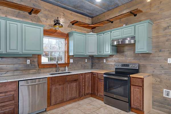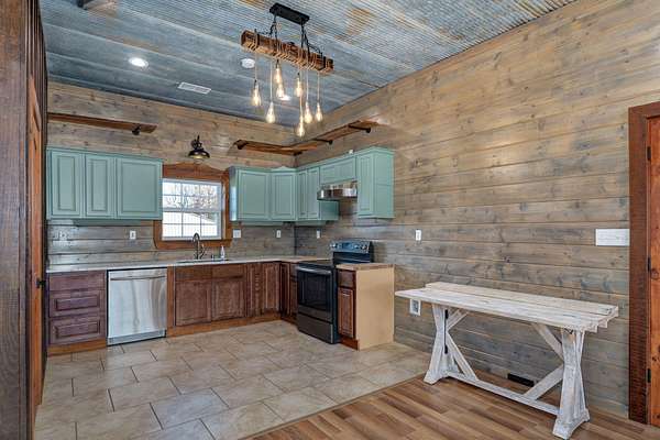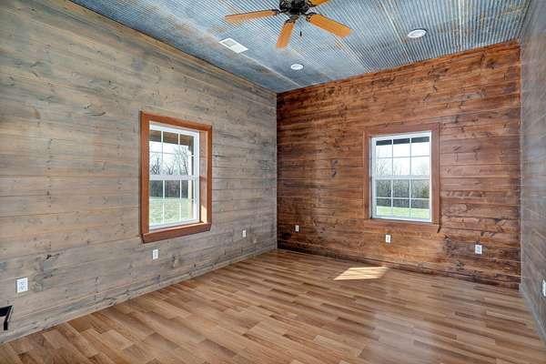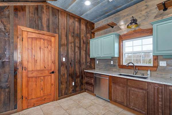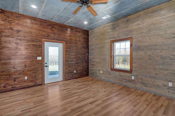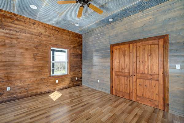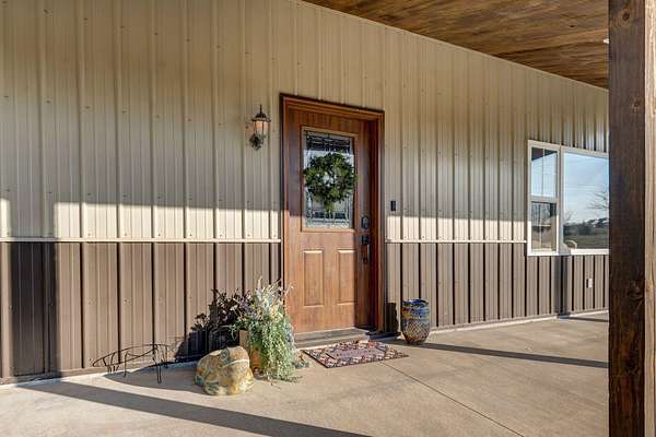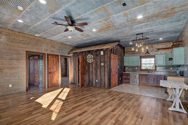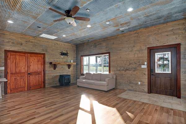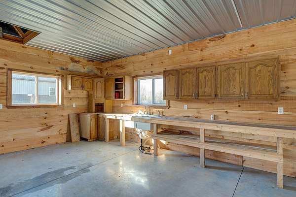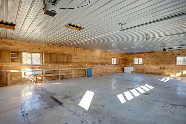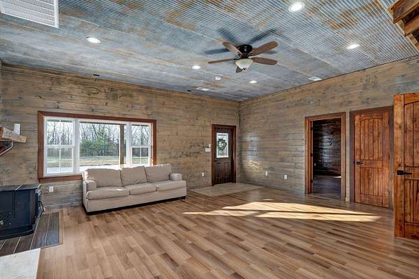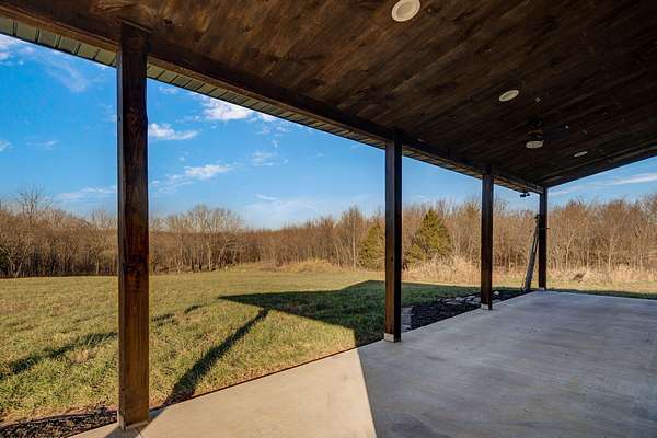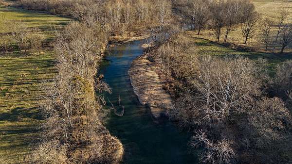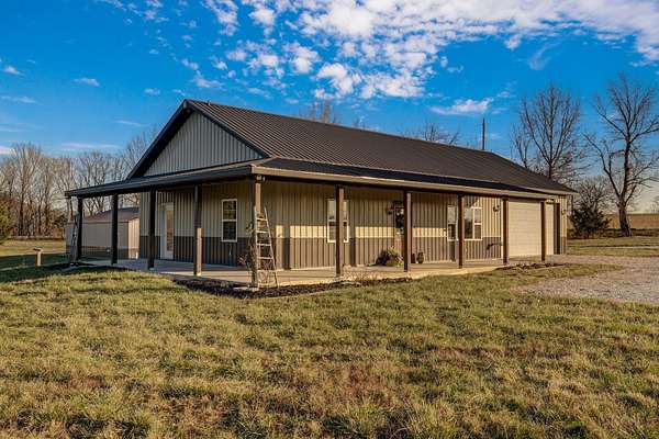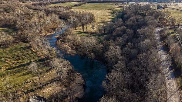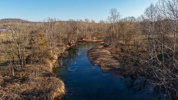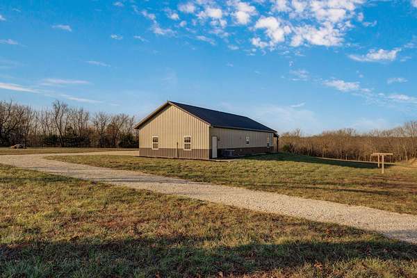 The beautiful approach through the hills of Fair Grove brings you home to this nearly 9-acre retreat, tucked between rolling hills and mature trees with a park-like setting. Sitting alongside the Little Pomme de Terre River, this property offers privacy, scenery, and space while remaining just minutes from Springfield.The interior opens to a spacious main living area featuring rustic cabin character throughout. Two oversized bedrooms offer generous closet space, complemented by a beautifully finished full bath with dual rainfall showerheads and a walk-in shower. A large pantry with granite and butcher-block countertops provides excellent storage and function, and double-door access leads directly into the heated garage space.The two-car garage features oversized doors and is fully equipped with a wash sink, water softener, central HVAC, and a tankless water heater. A pellet stove efficiently heats the entire living space, adding both warmth and charm to the natural surroundings outside and overall feel inside.Step outside and take in unmatched back-porch views, frequent wildlife sightings, and breathtaking sunsets. The north portion of the property overlooks the river below. The land is open yet private, making it ideal for those seeking a peaceful, secluded setting.A 30' x 48' insulated shop with electric and three additional stalls offers plenty of room for vehicles, equipment, and recreational toys. Built in 2020 and impeccably maintained, this property feels nearly brand new and offers a rare opportunity to own a high-quality build on beautiful acreage with water frontage.