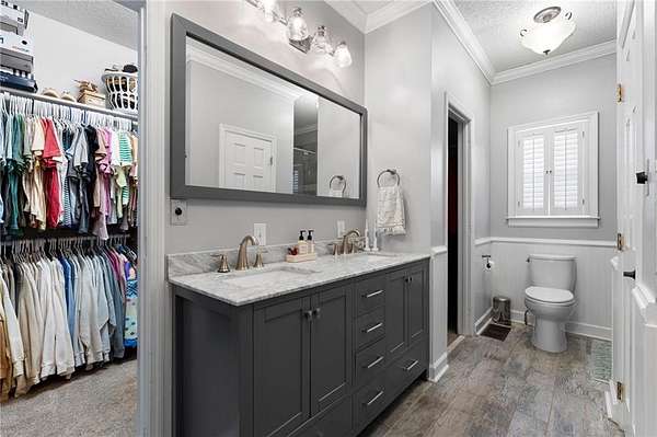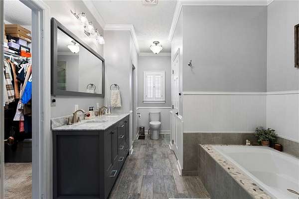 - Beamed Ceilings, Cathedral Ceiling(s), Double Vanity, Entrance Foyer, High Ceilings 9 ft Main, His and Hers Closets, Tray Ceiling(s), Walk-In Closet(s)