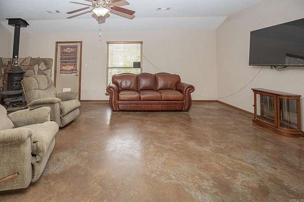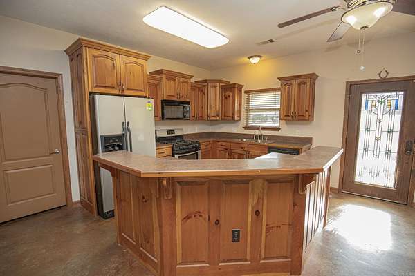 Est $1,868/moWelcome home to this desirable area in East End. It has it all. The open floor plan creates plenty of utilized space. The beautiful stained concrete floor is very durable and worry free. The kitchen cabinets are costume built. Master bedroom has a big walk in closet that connects to the laundry room. It sits on 5 beautiful acres and comes with a 24' x 30' shop, storm shelter, and a two car garage.