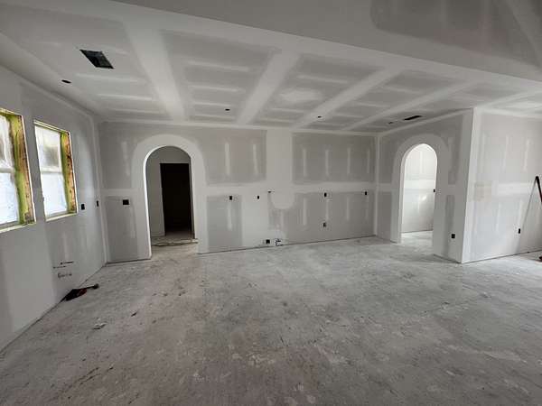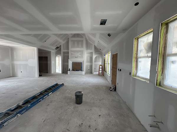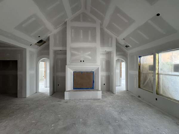 Inside, soaring ceilings, arched walkways, and an open-concept floor plan create a warm yet elevated atmosphere perfect for everyday living and entertaining. The living room is anchored by a striking plaster wood-burning fireplace with custom built-ins on both sides, offering a beautiful focal point to the space. The chef’s kitchen features a gas range, designer fixtures, and seamless flow into the main living and dining areas.