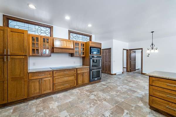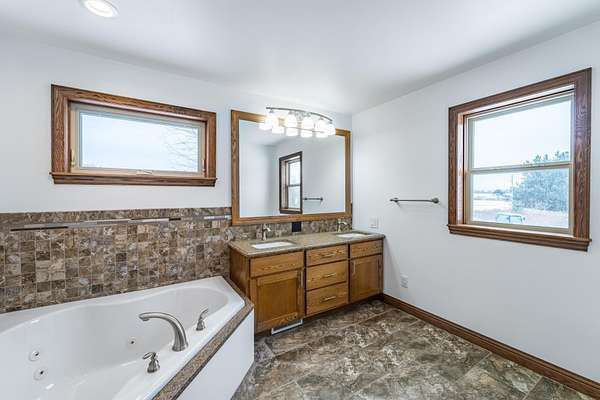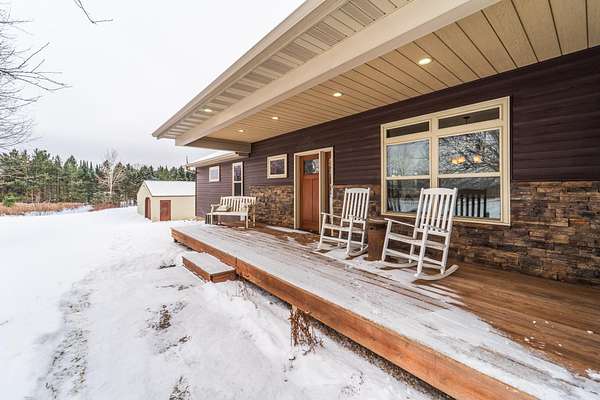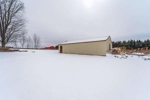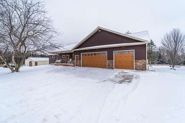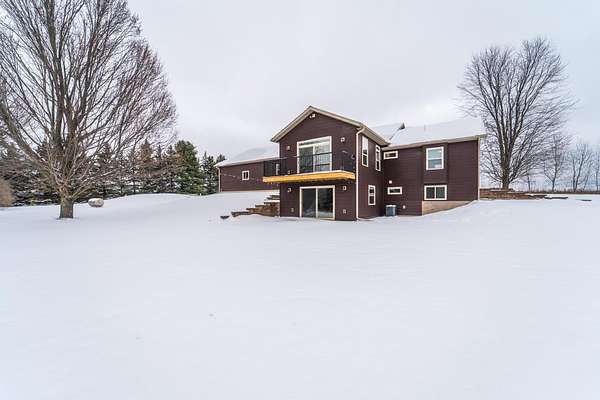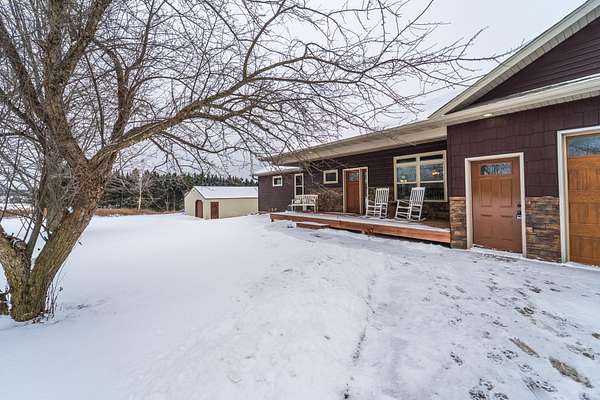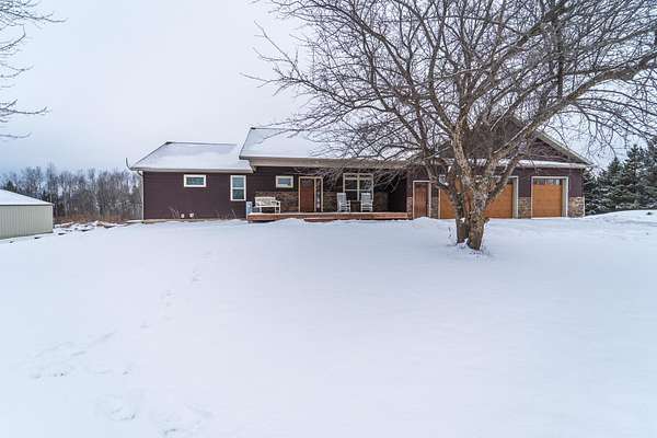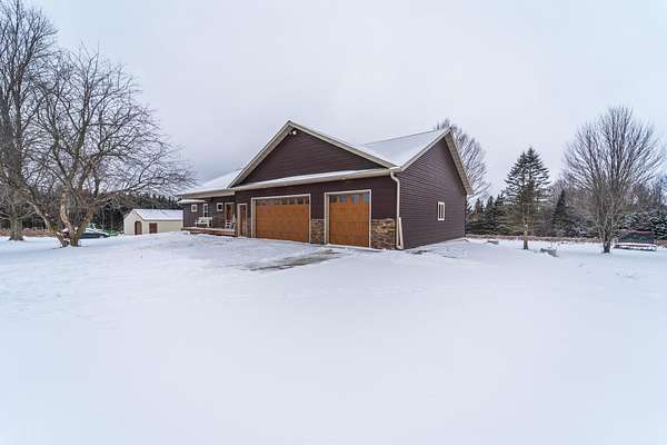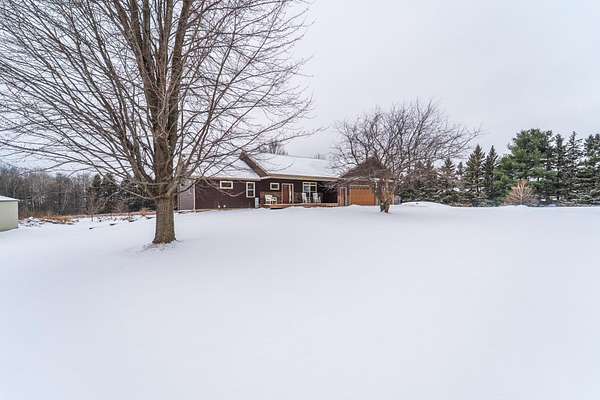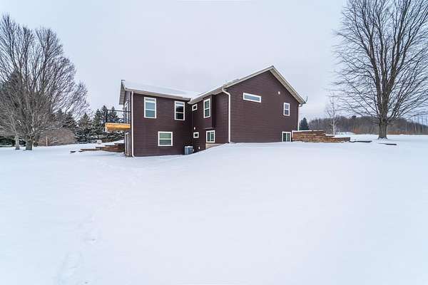 Discover an exceptional blend of refined craftsmanship and serene country elegance on this stunning 7-acre estate. Rebuilt from the ground up in 2014, this near-new, 5-bedroom residence showcases premium finishes and timeless design, beginning with Kolbe windows and exterior doors, elegant tile flooring throughout, and exquisite custom oak cabinetry paired with sleek quartz surfaces throughout the home. The main level welcomes you with a spacious, open floor plan with dedicated dining room, massive kitchen, and connecting living room. Its private primary suite offers a spa-inspired retreat complete with a whirlpool tub, separate shower, and beautifully crafted custom cabinetry. Morning light pours onto the expansive east-facing front porch perfectly positioned for peaceful sunrise coffee moments while the maintenance-free deck at the rear overlooks a picturesque landscape of mature fruit trees and tranquil natural views. The lower level elevates the homes versatility with a generous family room, kitchenette, and walk-out design enhanced by oversized patio doors that frame the surrounding beauty and flood the space with natural light. Three spacious bedrooms create ideal accommodations for guests or elegant multigenerational living. An oversized 3-car attached garage and an additional pole shed with electric and partial concrete flooring provide exceptional storage and hobby space. Outdoors, the property unfolds with a blend of open acreage, scattered woods, and a gentle stream skirting the property line an idyllic backdrop for those seeking privacy and connection to nature. Modern comfort is assured with a high-efficiency forced-air furnace, central air conditioning, an on-demand boiler system offering endless hot water and hydronic heating, and a mound septic system. All kitchen appliances are included, ensuring a seamless move-in experience. This remarkable estate offers luxury living wrapped in tranquility expertly crafted, meticulously maintained, and designed to be enjoyed for generations.