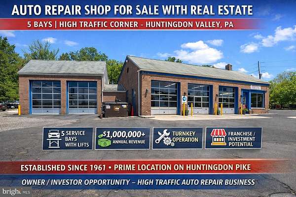Chuck's Service Center - Automotive Repair Shop for Sale | Real Estate Included | Huntingdon Valley, PA Exceptional opportunity to acquire a long-established, profitable auto repair business with real estate located on highly traveled Huntingdon Pike at the signalized intersection of Welsh Rd & Philmont Avenue in Huntingdon Valley, PA. This high-visibility, high-traffic location offers outstanding exposure for an automotive service business, mechanic shop, or franchise operation. Operating continuously since 1961, Chuck's Service Center is a well-known, community-trusted auto repair facility with strong repeat business, multi-generational clientele, and consistent cash flow. The property features 5 service bays / garage bays including 4 lifts (10,000 lb capacity) and 1 lift (12,000 lb capacity). The sale includes a full suite of automotive repair equipment and FF&E, including alignment system, diagnostic equipment, A/C machine, compressors, waste oil heater, tire machines, strut compressor, tools, office furniture, and inventory. This is a turnkey auto repair shop ready for immediate operation. The business services approximately 2,500 vehicles annually, generating $1,000,000 in gross revenue, currently operated with 3 mechanics, with clear upside potential. Value-add opportunities include extended weekday hours, weekend operations, additional technicians, improved signage, digital marketing, and targeted advertising to expand the customer base and increase market share. Ideal for owner-operator, investor, or automotive franchise conversion (Midas, Meineke, Monroe, Firestone, etc.). Suitable for general auto repair, fleet service, tire shop, performance shop, inspection station, or specialty automotive use (verify zoning for alternate uses). Flexible ownership structure: the layout allows for owner-user occupancy with potential leaseback income. Seller is open to leasing back service bays, providing immediate income stream and business continuity. Transition assistance available, including training and customer introductions. One experienced owner/operator is willing to remain, ensuring operational stability, goodwill retention, and a smooth transition.