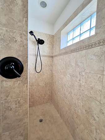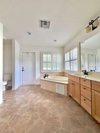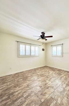 The home features a new roof (2024), fresh exterior paint, dual-zone A/C with two units, upgraded windows, and plantation shutters throughout. Inside, you'll find a thoughtfully designed layout with no carpet--low-maintenance flooring and abundant storage, including a large laundry room and double walk-in closets in the master suite. The primary bathroom offers a large jetted garden tub, double vanity, and separate walk-in shower for a true retreat.