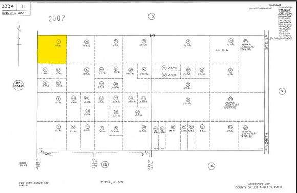 Est $223/mo10.63 acre lot at the southeast corner of 230th St E and Ave H8. The west border runs 680 feet along 230th St E. Zoned A11 for agriculture, animals, and a home. APN 3334-011-001.