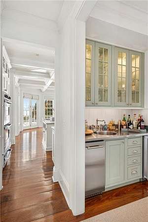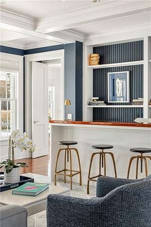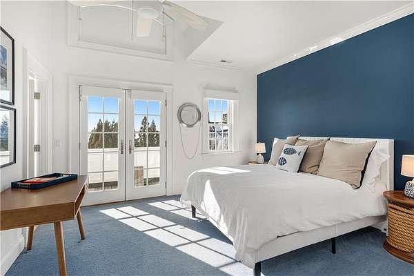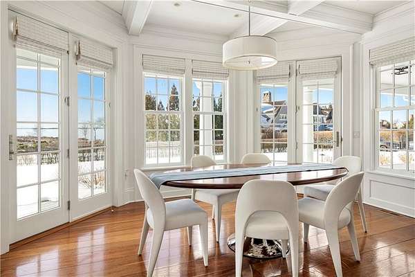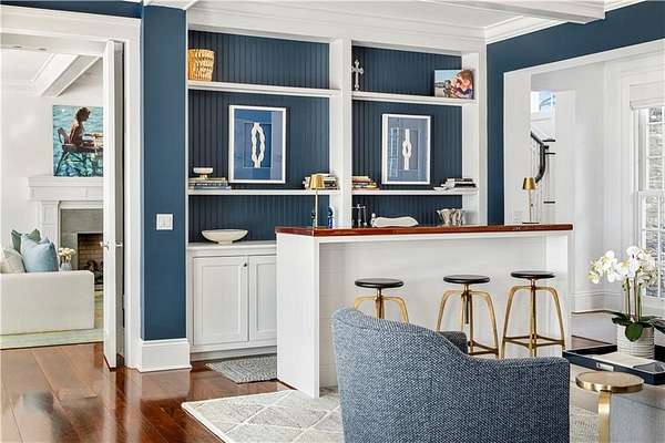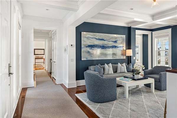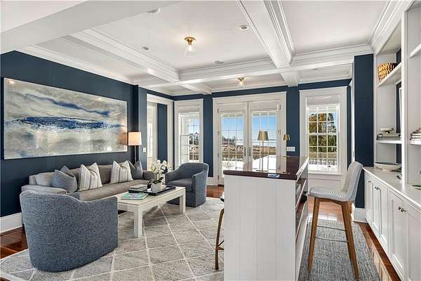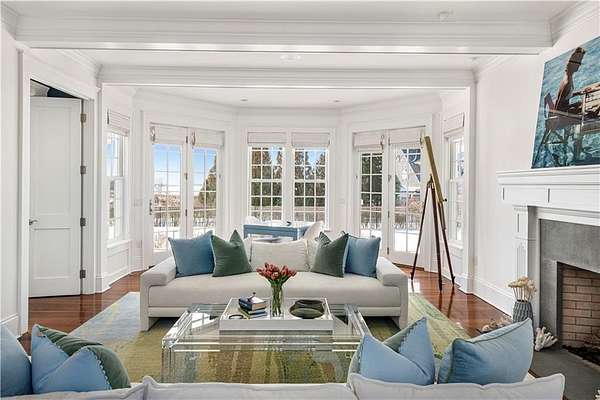 A gated, winding drive creates a sense of arrival, leading to a classic coastal facade and covered mahogany entry. Inside, light-filled interiors blend timeless New England architecture with sophisticated coastal finishes designed for both formal entertaining and relaxed seaside living. The centrally positioned designer kitchen serves as the heart of the home, complete with an oversized island, premium cobalt blue appliances, and a sunlit dining area overlooking the water. French doors open to a stone terrace, ideal for seamless indoor-outdoor gatherings during Newport's summer season. The main level continues with a living room enhanced by custom millwork and direct access to the mahogany front porch. A private office or optional first-floor bedroom with ensuite bath offers flexibility for guests or single-level living. The great room showcases vaulted ceilings and a fieldstone fireplace, delivering warmth and architectural character. A separate rear staircase leads to private guest quarters with sitting area, bedroom, and ensuite bath- well suited for extended stays. Upstairs, a window-lined hallway leads to three additional ensuite bedrooms, each offering private decks with water views-perfect for enjoying morning coffee or evening sunsets. Additional amenities include a private putting green, whole-house generator, deeded access to the nearby Tower pool, and inclusion of a separate buildable lot-offering long-term flexibility and investment potential.