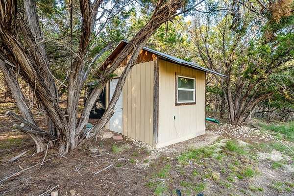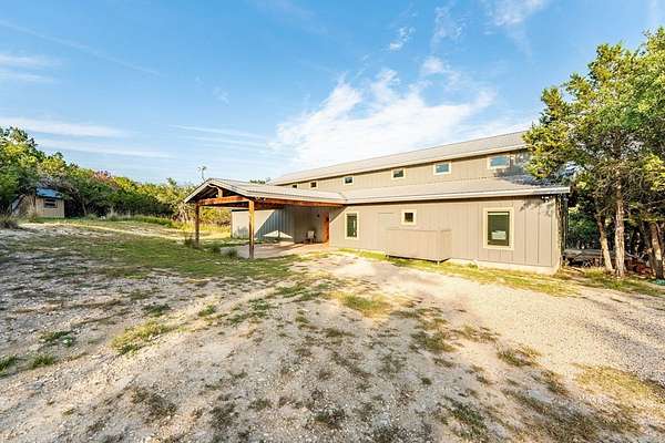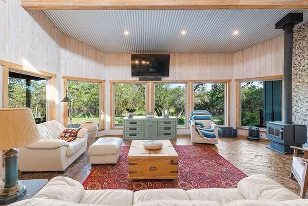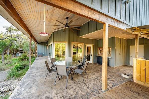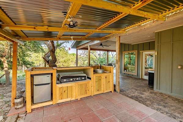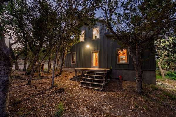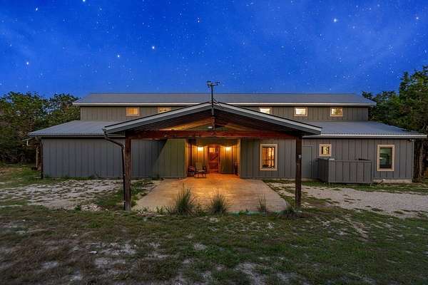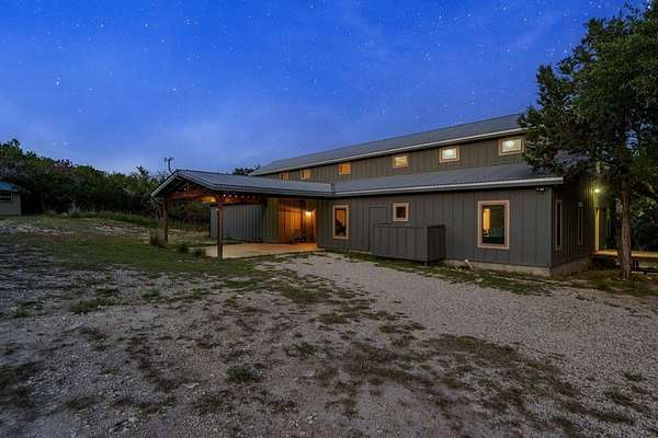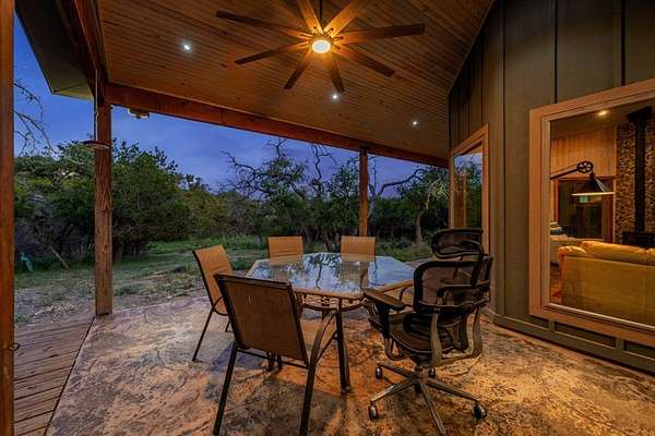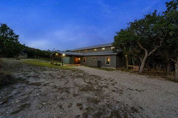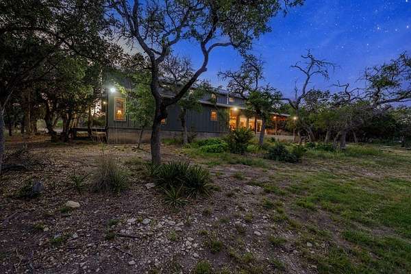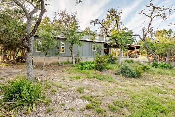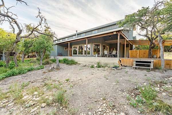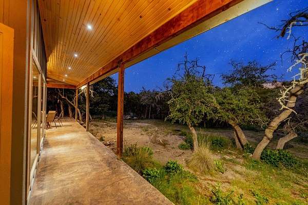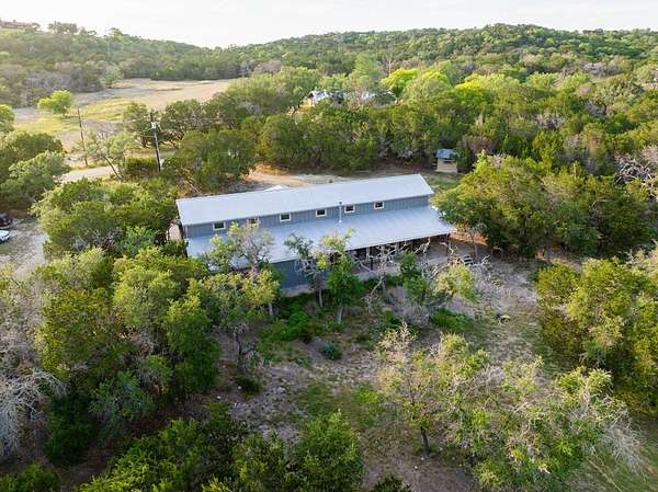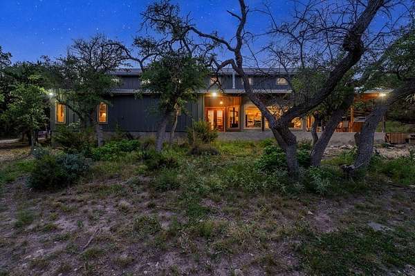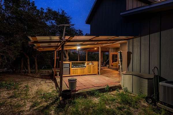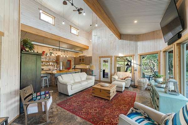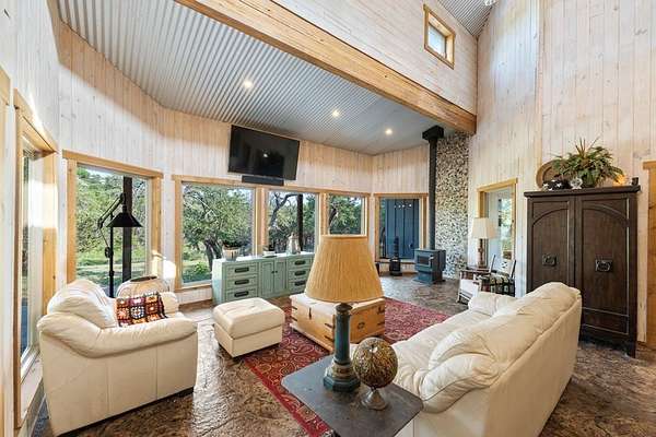 Unique rustic ranch-style home created by a Southwest artist, chef, and hobbyist. Located just outside Kerrville city limits-no permits or city property taxes-this 3,460 sq. ft. home sits on 5 wooded acres. Features include 22-ft ceilings in the great room, 3 bedrooms downstairs, a large upstairs studio with half bath, and a chef's kitchen with 7-ft sink, 4 counters, and a walk-through pantry. Both full baths are handicap-accessible with heated, personal-washing toilets. Master bath includes a 2-person FAR infrared sauna and Japanese Ofuro soaking tub. "On-demand" hot water, twin HVAC systems with quad zoning, and no carpet throughout. Enjoy panoramic wooded views, a large patio, deck, and outdoor cooking area. Built for low-maintenance living with advanced technology, RV hookups, and space for a motorhome. A diesel generator powers the entire home when needed. Also includes a deep water well and 2,500-gallon water tank. Most furnishings and decor to convey making this an ideal turnkey residence as a primary or secondary home.
