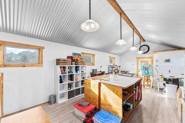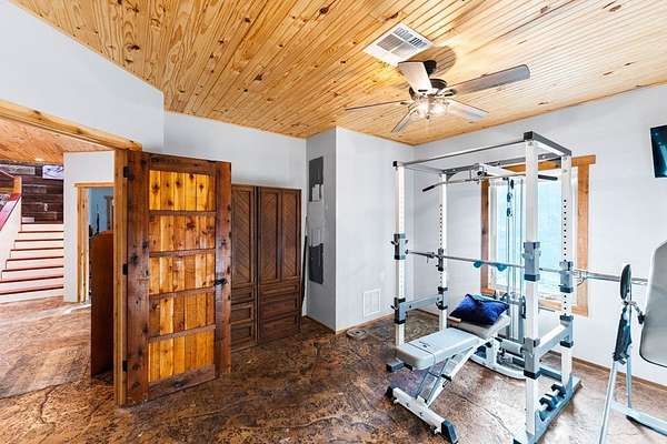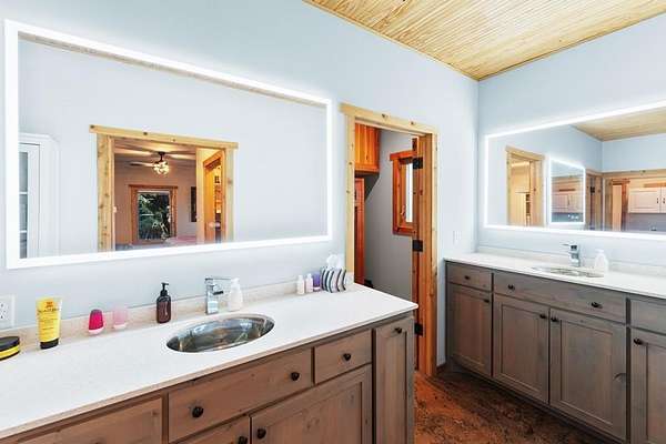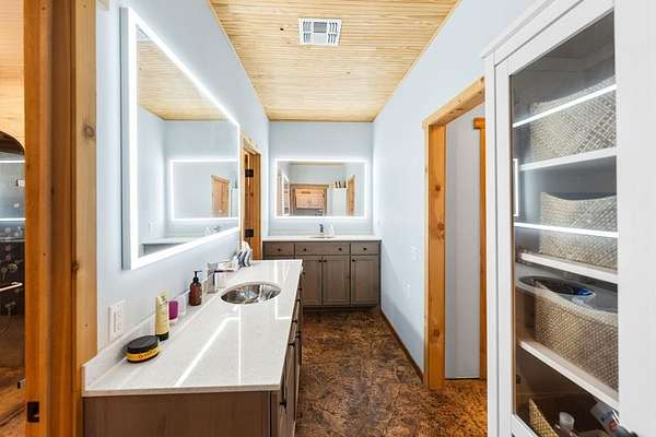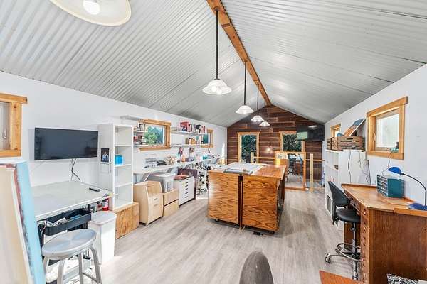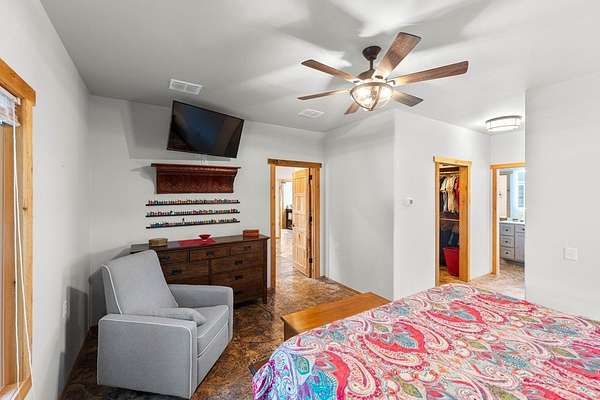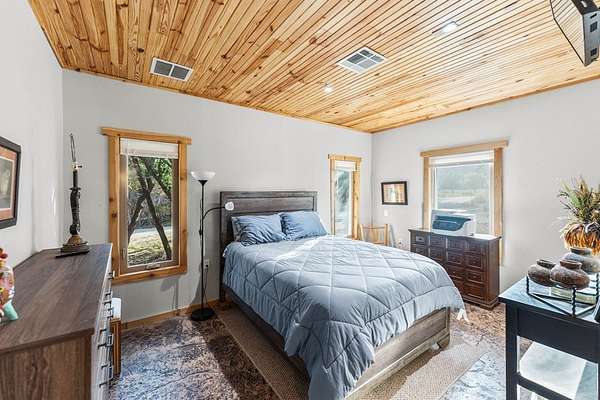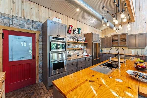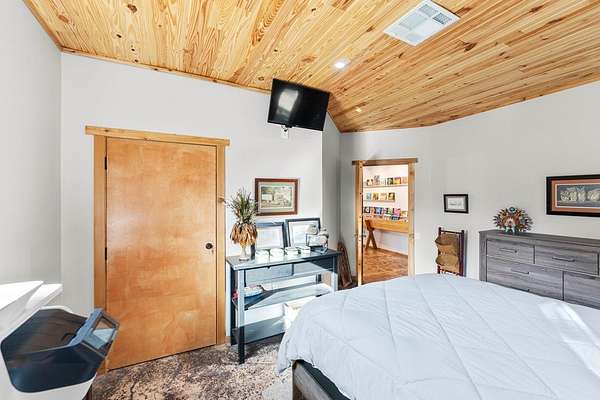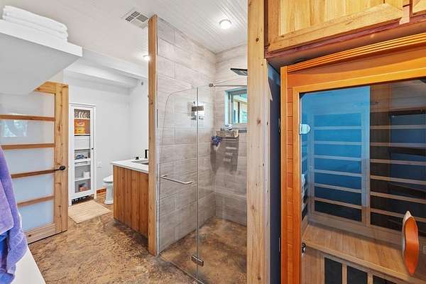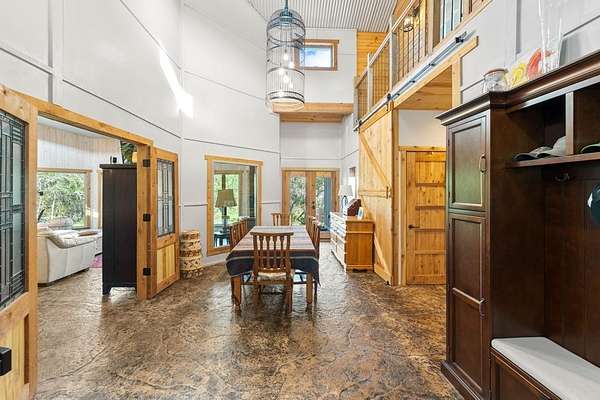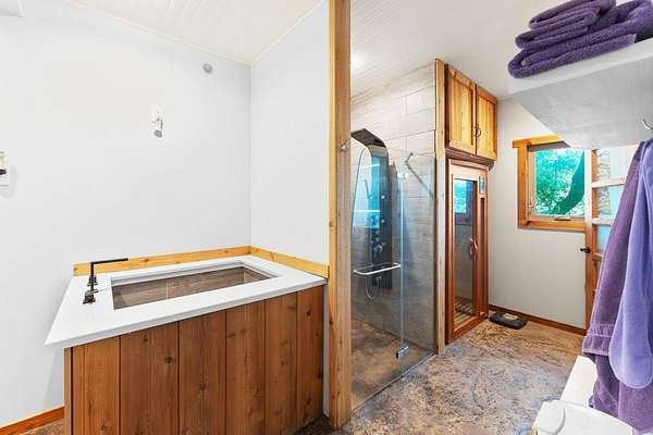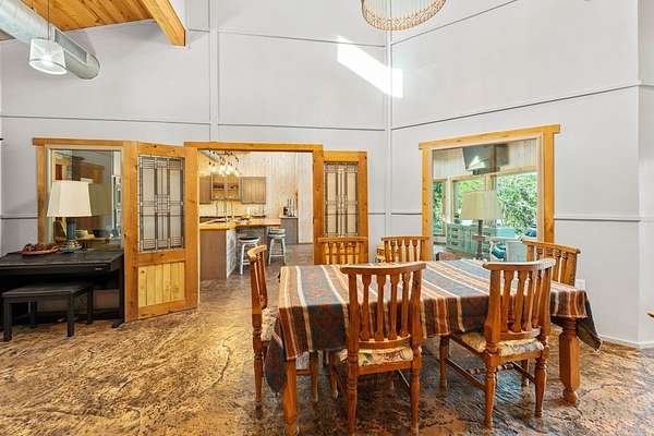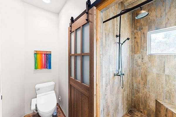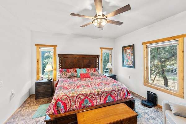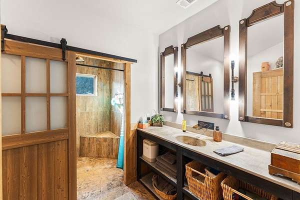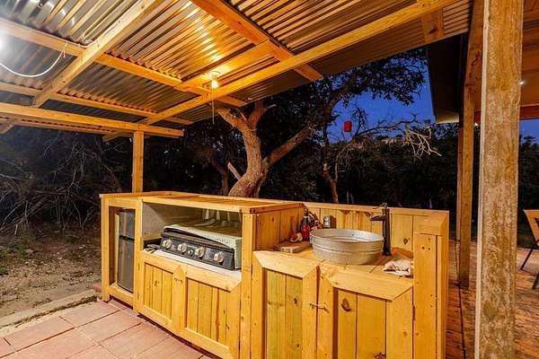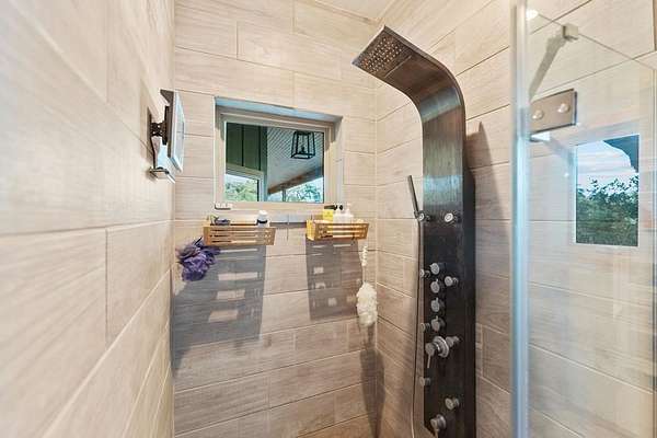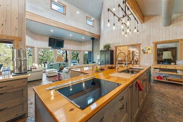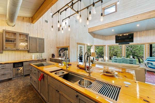 Unique rustic ranch-style home created by a Southwest artist, chef, and hobbyist. Located just outside Kerrville city limits-no permits or city property taxes-this 3,460 sq. ft. home sits on 5 wooded acres. Features include 22-ft ceilings in the great room, 3 bedrooms downstairs, a large upstairs studio with half bath, and a chef's kitchen with 7-ft sink, 4 counters, and a walk-through pantry. Both full baths are handicap-accessible with heated, personal-washing toilets. Master bath includes a 2-person FAR infrared sauna and Japanese Ofuro soaking tub. "On-demand" hot water, twin HVAC systems with quad zoning, and no carpet throughout. Enjoy panoramic wooded views, a large patio, deck, and outdoor cooking area. Built for low-maintenance living with advanced technology, RV hookups, and space for a motorhome. A diesel generator powers the entire home when needed. Also includes a deep water well and 2,500-gallon water tank. Most furnishings and decor to convey making this an ideal turnkey residence as a primary or secondary home.