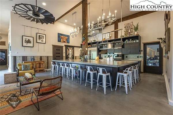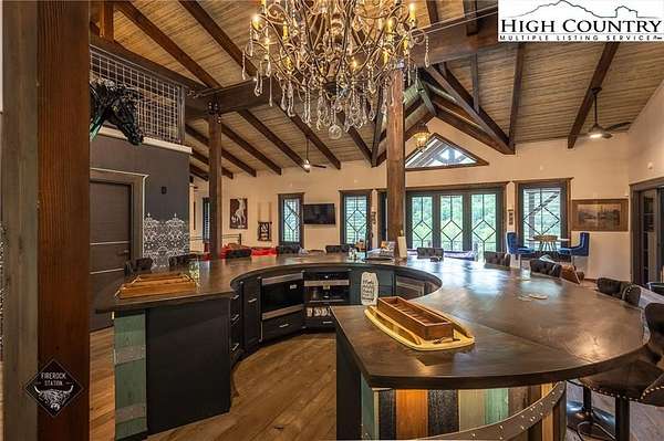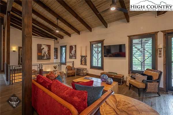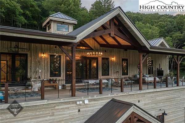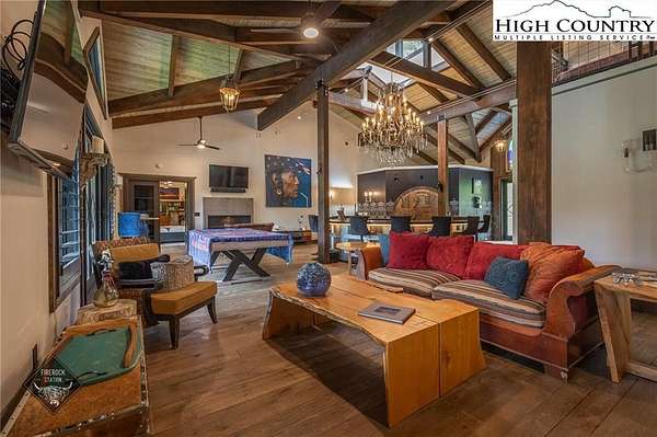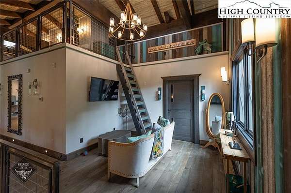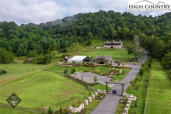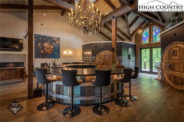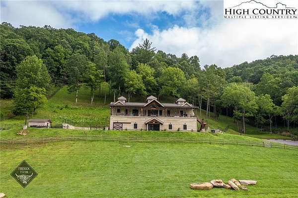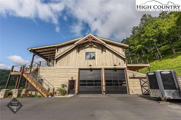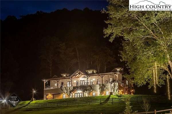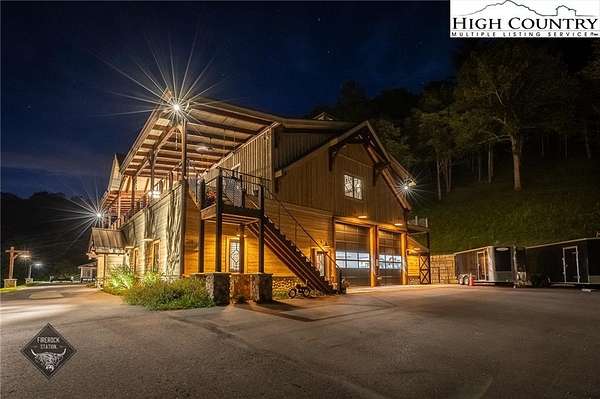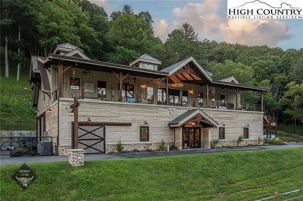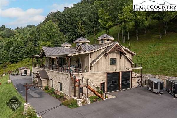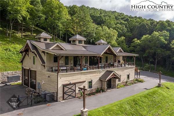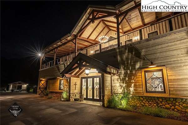 Luxurious custom and truly one-of-a-kind timber frame residential home perched above the High Country's award winning wedding venue, Firerock Station. Can be purchased separately or together with the venue for $6,250,000. First floor has a massive kitchen with a hand poured concrete island that you could literally have a dance party on. Dining area with gas fireplace, small sitting area, walk-in pantry, bonus room with en-suite including laundry as well as a lofted office space above. Take the elevator (should you wish) upstairs to the massive great room with cathedral ceiling, hand scraped oak flooring, horseshoe bar with reclaimed barn wood, game area with second gas fireplace, main laundry room, theatre room with 7 reclining theatre seats & projector screen, guest bedroom with en-suite plus additional sleeping space in the loft. Impressive primary suite with an incredibly large marble shower, oversized jacuzzi tub with fireplace, multiple walk in closets as well as a personal gym. Massive RV garage with two additional ATV garages & space for about 4 addtl vehicles as well as an insane amount of storage. Behind house is a fully fenced in yard that goes about half way up to the ridge. There is a covered deck that spans the length of the home & offers lovely pastoral views. This property would make an excellent Short Term Rental & is being offered fully furnished. Because the ingress/egress is directly from the garage the first floor sleeping area cannot be called a bedroom. Septic system is shared with the venue. Boundary survey has been completed in order to subdivide the venue & the house, acreage advertised is based on that survey. Lead listing agent is related to seller & seller is also a licensed NC broker.