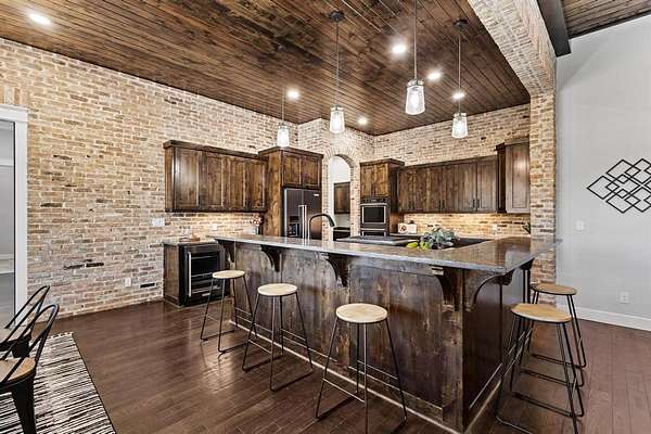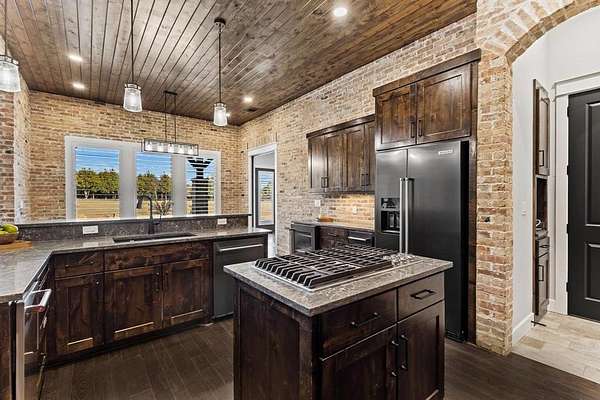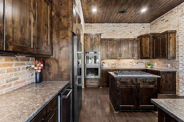 The kitchen showcases custom stained cabinetry throughout, custom brick accents sourced from a specialty supplier in Chicago, and generous countertop space. A wrap-around island with elevated bar seating for six creates a natural gathering space, while a separate center island houses the 5-burner gas cooktop. Matching modern appliances include a refrigerator, double wall ovens, undercounter wine chiller, undercounter ice maker, microwave drawer, and undercounter trash compactor.