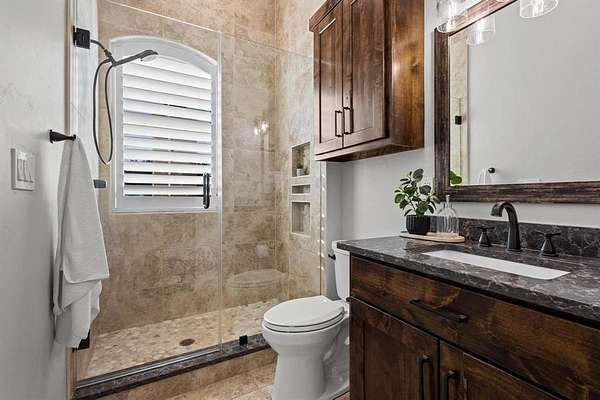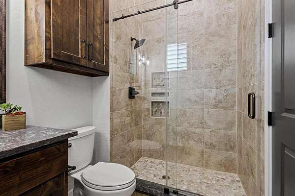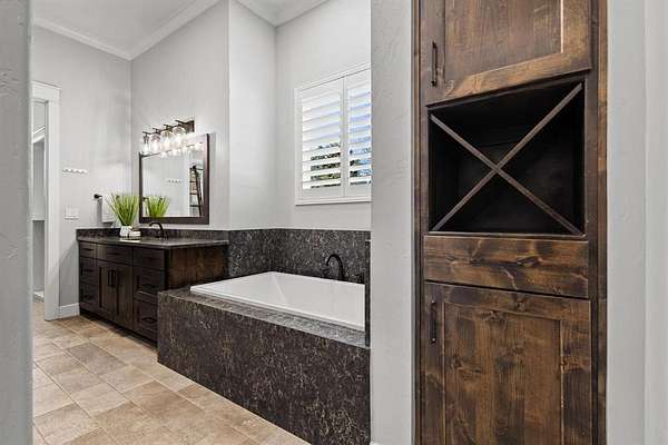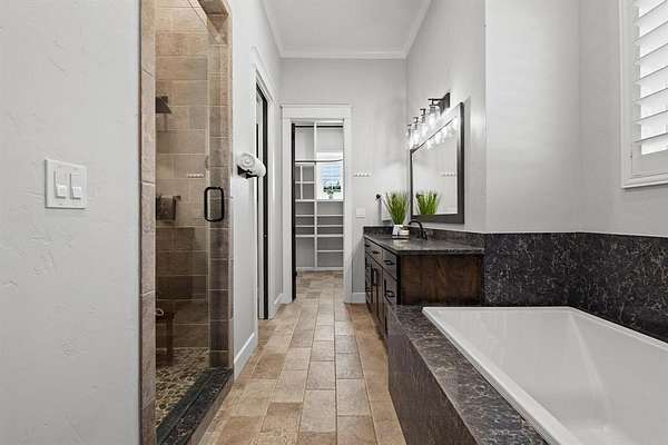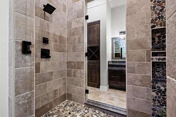 Nearly new custom home built in 2022 offering exceptional design, privacy, and resort-style outdoor living, with attention to detail and craftsmanship throughout. This all-brick residence features 4 bedrooms and 4 full bathrooms, including a thoughtfully designed primary suite with two separate private toilet rooms, individual vanity areas, and a spacious walk-through closet with access from both sides of the ensuite bath.