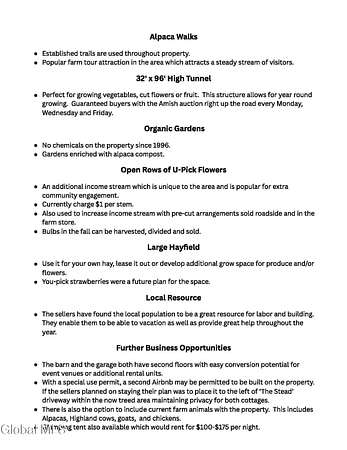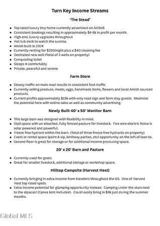 Welcome to your turnkey income-producing farmstead! Enjoy country living while earning from a top-rated luxury tiny home Airbnb, alpaca walks, hilltop campsite, organic gardens & profitable farm store. Features include a new 40'x50' monitor barn, 20x20 barn, 32'x96' high tunnel greenhouse, organic gardens, hayfields, walking trails, babbling stream & u-pick flowers. New detached garage with loft with main house (3 bed, 1 bath). New tiny luxury cottage (sleeps 4) with upgrades galore including jacuzzi deck with separate drive! Opportunity to expand with wedding venue or simple photography site. Also, rental of portion of barn for artist studio potential. Breathtaking views, unmatched serenity & room to grow make this a rare opportunity to live, work, and thrive all in one beautiful place!