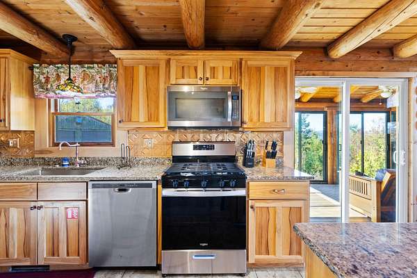 PRIVACY, BIG VIEWS, 30 ACRES, LOG CABIN, OPEN CONCEPT, LOFT, FINISHED BASEMENT, HOT TUB - Basically this place has it all. Beautiful kitchen with quartz countertops/large island/hickory cabinets leads into the dining room and large family room with soaring ceilings. A wall of windows brings the outdoors inside where you can cozy up to a beautiful wood burning fireplace. This house really suits large gatherings of family and friends. You have a main floor bed and full bath, a loft bedroom and full bath. Additional sleeping quarters and full bath in the finished basement. The large TV family room downstairs currently has room for a large watching area and a foosball table. French doors lead out to a spacious hot tub. Maybe you guessed this house did really well as a short term rental and you would be right. Whether you want to live here, vacation here or share the space with travelers from all over, you can't go wrong with this wonderful retreat in the White Mountains. Now for the best part, the sunset view from the three season porch and back deck overlooking the Connecticut River will leave you in awe every night. The back lawn with firepit is another gathering spot for your enjoyment. And there is more, with a nice detached two car garage for all your toys. If one of those toys is a snowmobile, you can slide right onto Corridor 5 at the bottom of your property. Great location in Dalton. Come see for your yourself before the opportunity is gone.