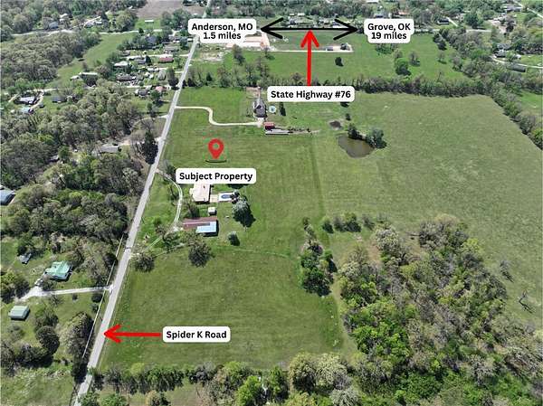 This 4-bedroom/2-bath beauty sitting just outside the city limits of Anderson, Missouri has been wonderfully maintained and sits dead center on a manicured 10-acre tract of ground that is perfect for simply maintaining your privacy or stocking the most gorgeous little hobby farm that you could dream up. Sitting just north of the home is a small 16'x16' outbuilding currently dubbed the ''man-cave'' that features a half bath and its own separate septic system; and north of this is the large 48'x84' barn (with 2-12' lean to's and a small tack room) to help facilitate your hobby farm dreams. Out back you'll find a large and covered patio space on the way to your inground pool and gazebo area, the perfect setting for entertaining groups of friends and family, both large and small. All of this, with the convenience of being located within 35 miles of Joplin, MO and Northwest Arkansas airport, as well as less than 20 miles from Grove, OK and Grand Lake make 231 Spider K Road the perfect home in the perfect location.