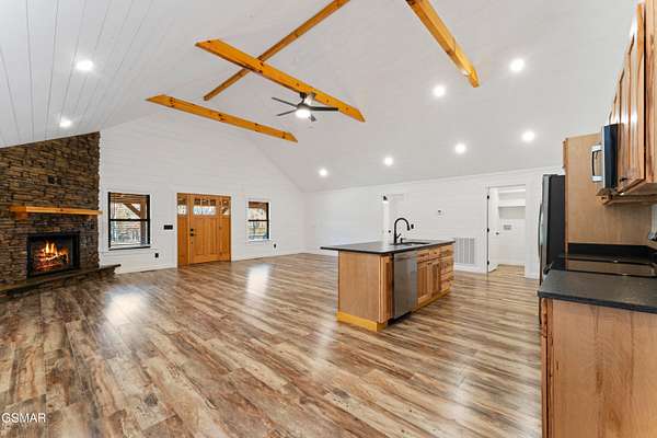 New Construction! Located in Stunning Sunset Pointe at Douglas Lake, Gated Community! Being sold below appraised value, this beautiful high end custom built wood rancher is offered with a deeded boat slip, and is situated on 1.89 level, partially wooded acres for optimal privacy!!! This 1948 sq ft 3 bedroom, 2 bath modern rustic rancher offers open concept living with a black, white and natural wood Color scheme inside and out, 2 gas stone fireplaces and topped off with 2 large porches for relaxing as well as an oversized 2 car garage. Step into the large great room with vaulted ceilings, exposed beams and large stone fireplace, all white tongue and groove throughout accentuating the natural wood accents, with recess lighting, adjoining the stylish kitchen area w/ custom cabinets, lg black granite island and stainless steel appliances as well as full size pantry. Master en suite offers a gorgeous bath with extra lg stone dual shower and soaking tub, as well as custom built walk in boutique style closet. You'll find two more large bedrooms on the opposite side allowing for extra privacy. Also included is a dedicated laundry/mudroom providing extra storage. Pull into this large driveway to experience this beautiful home. Community offers city water, underground utilities, lake access, club house, grilling area and more-gorgeous lake community! Must see! Easy access to I-40 and I-81 for your convenience. Perfect primary residence, short term rental or second home.
